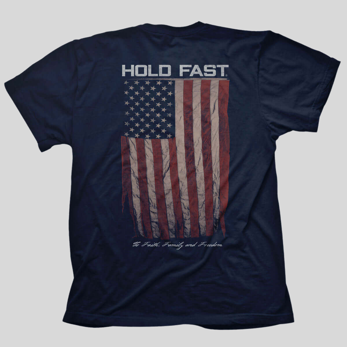 Hold fast to your faith in God and the enduring strength of our great nation in this “Antique Flag” Hold Fast® T-Shirt in Athletic Navy. We can celebrate these things because of the sacrifice of those who serve in the United States Armed Forces, and ultimately because of the sacrifice of our Lord and Savior, Jesus Christ.