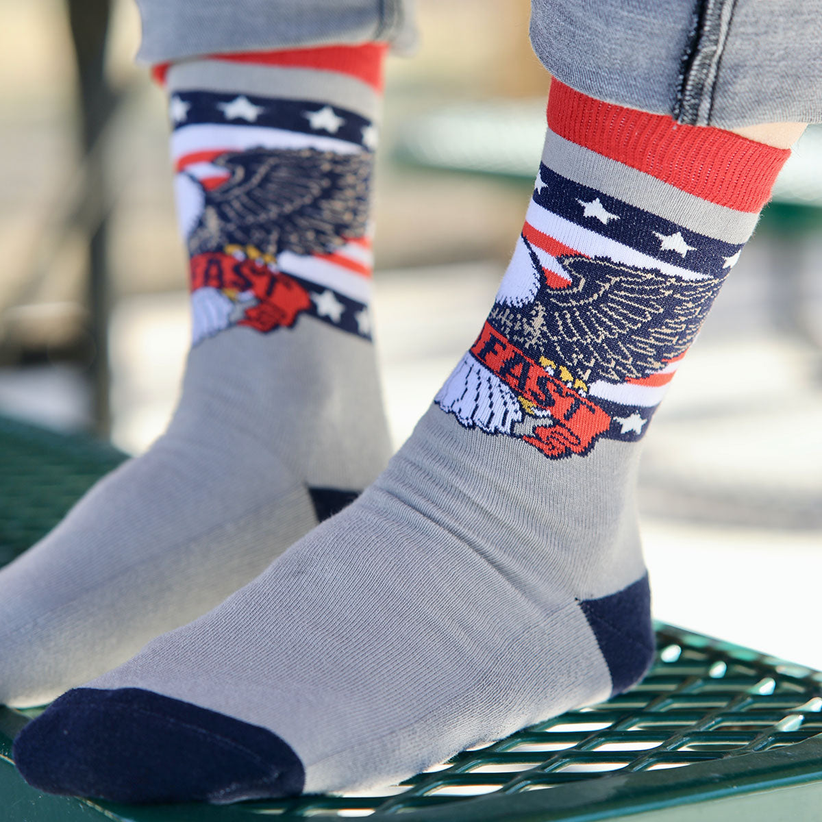 Make a bold declaration of independence in these spirited “Eagle” Socks by HOLD FAST®. Whatever threatens to enslave your spirit: stress, addiction, financial or relationship strain, sin...you are set free in the name of Jesus. Nothing can hold you back from His good plan for your life. Premium Men’s Hold Fast Crew Socks feature the fit + function guys need, with extra padding in the sole to alleviate foot fatigue in a breathable cotton blend.