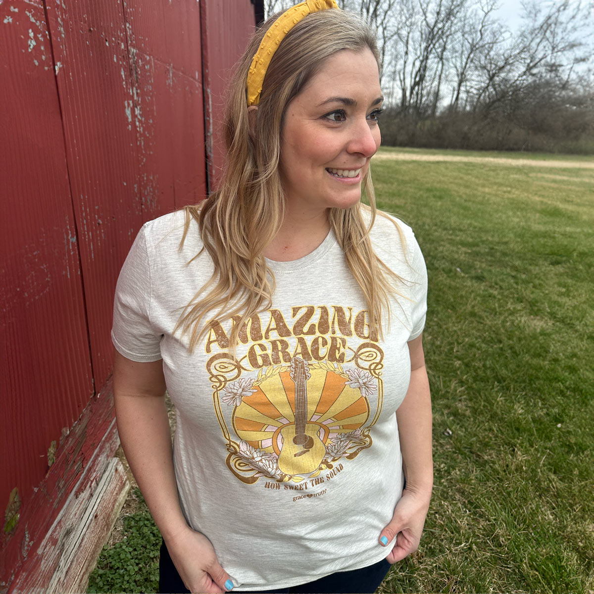 Dress up and express your faith in style. The Grace Guitar™ shirt from grace & truth® features a retro-inspired design that captures the essence of joyful worship. Its oatmeal heather background provides a neutral canvas for the retro guitar graphic.