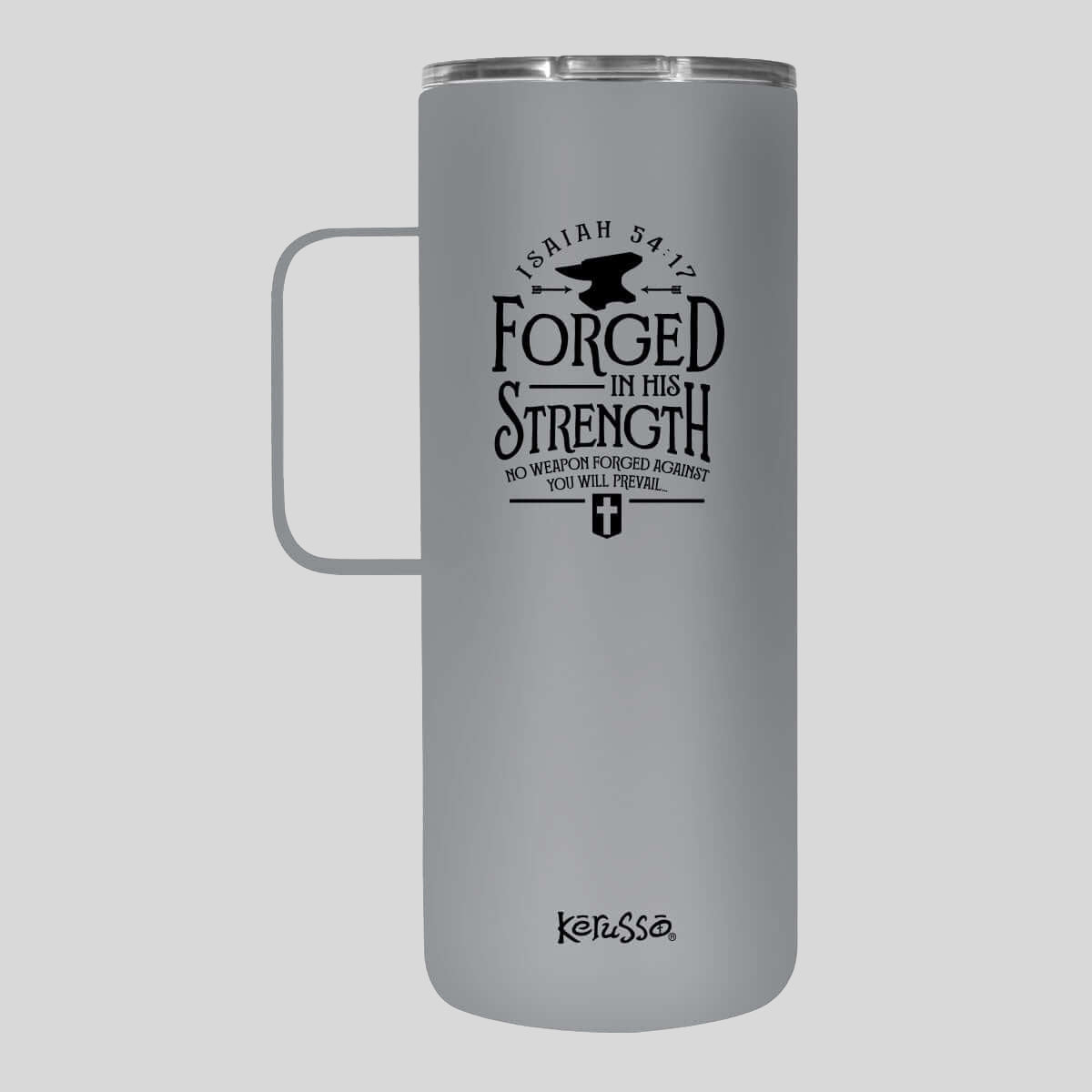 Share the steely strength of your faith when you carry this rugged “Forged” Kerusso® 22 oz. Stainless Steel Mug with Handle in Gray. When you are going through trials and tests that seem impossible you have to trust that you are being formed into a better and stronger person — you are being forged into the image of Christ. This contemporary handled mug is designed to fit most car cup holders, is sweat-free, and keeps drinks piping hot or ice-cold for hours. It’s a practical vessel for home, work, or the car.