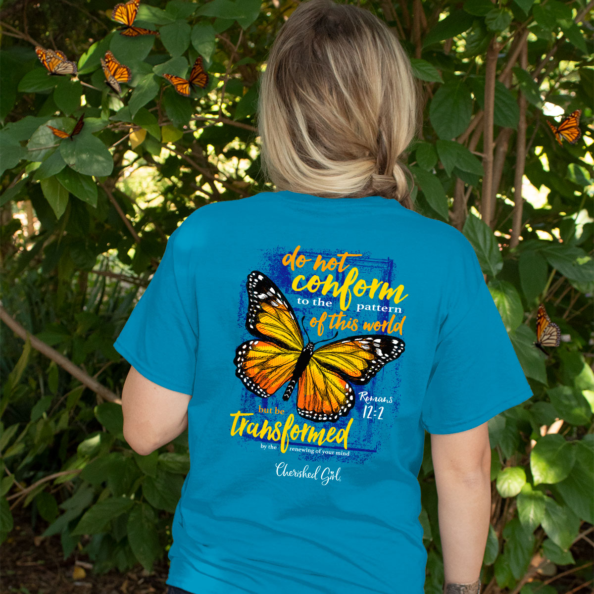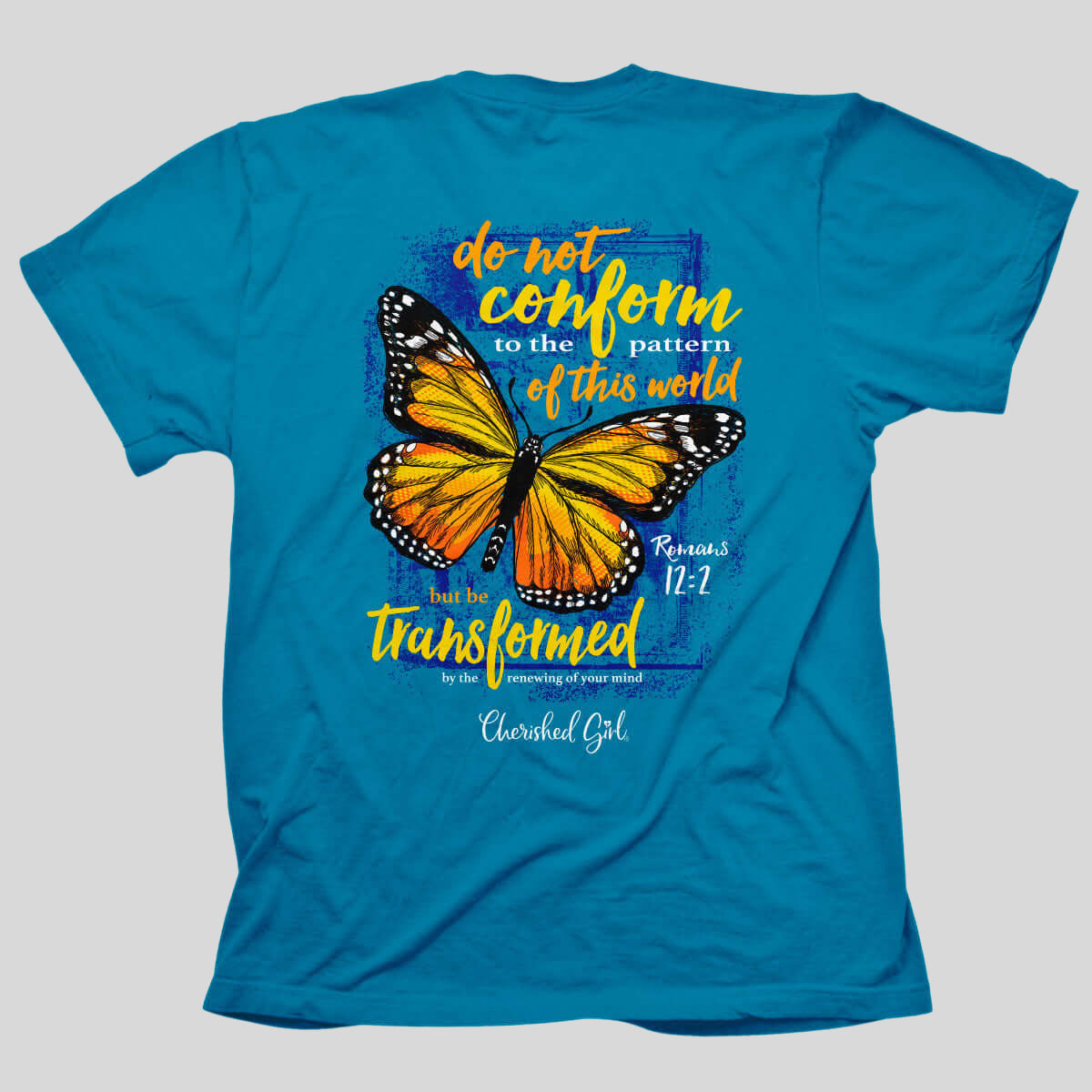 The transformed butterfly shirt has a striking blend of vibrant colors and meaningful symbolism. Its pacific blue background provides a calm base, reminiscent of the endless possibilities of a clear sky. Its bright yellow and orange butterfly symbolizes transformation and new beginnings. Complementing the butterfly are inspiring words that show the power of faith for spiritual renewal.