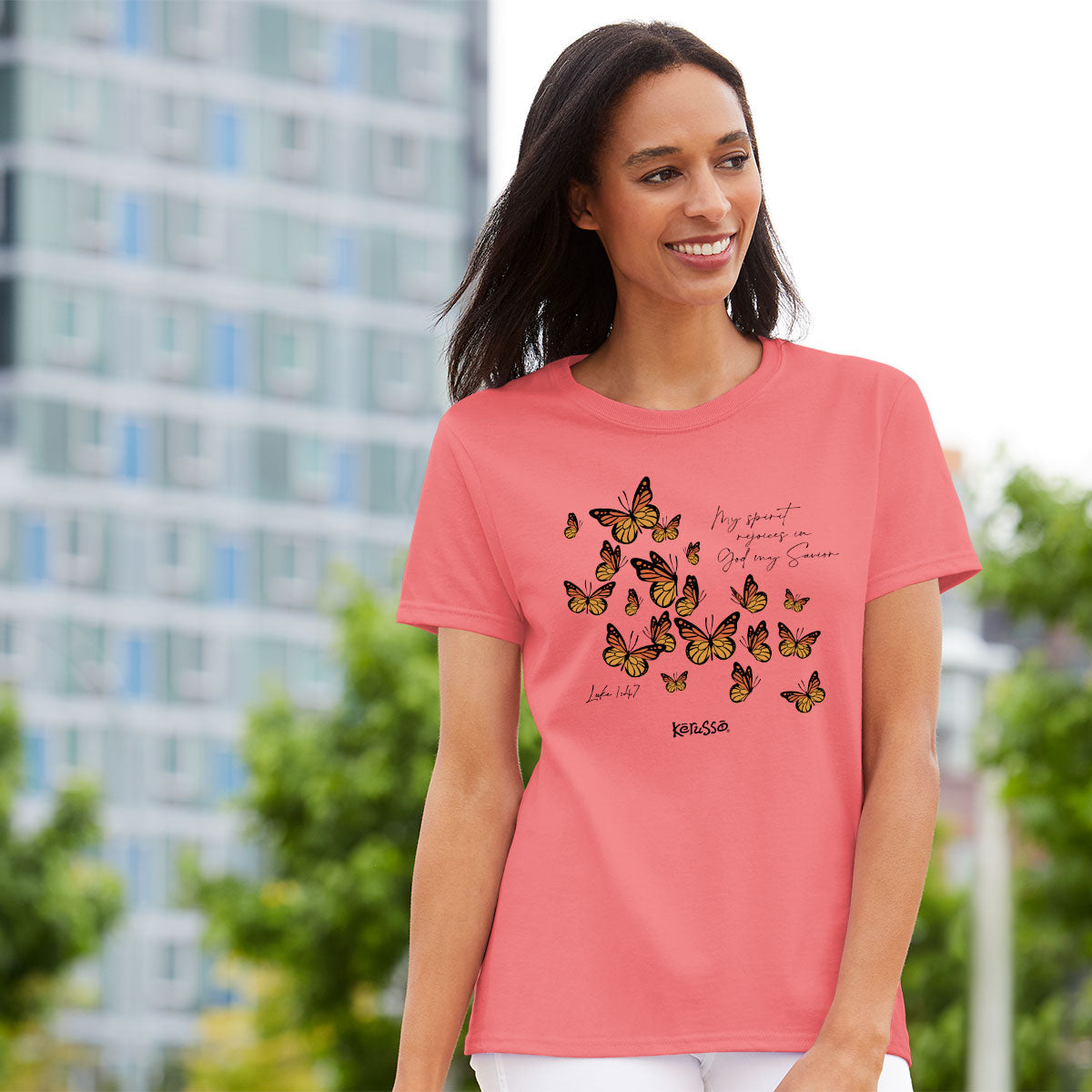 Delight in your faith when you wear this fanciful “My Spirit Rejoices” Kerusso® T-Shirt in Sorbet. God’s goodness is worthy of celebrating in every season, and for so many beautiful reasons.