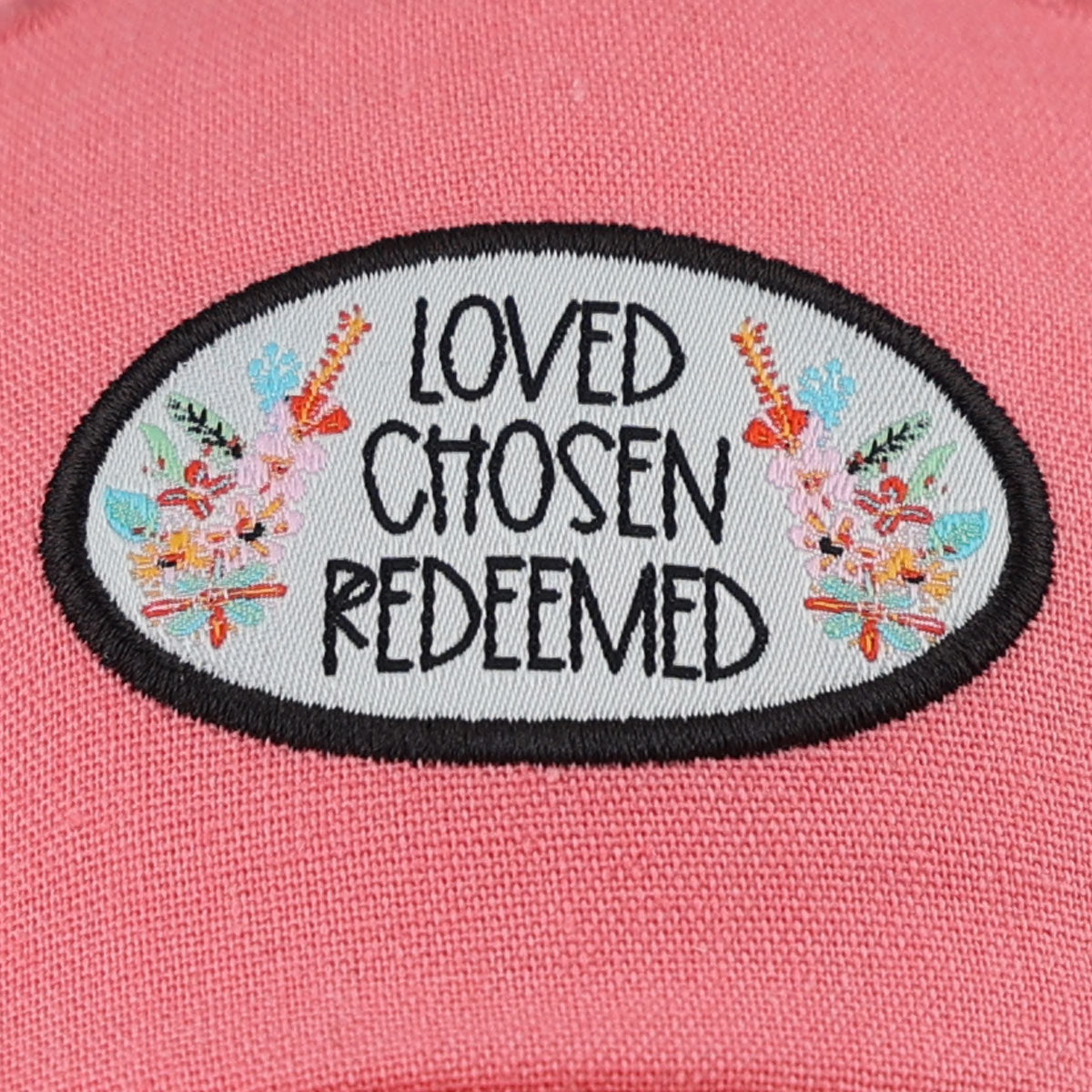 Share a thoughtful status update in this “Loved Chosen Redeemed” Cap by Cherished Girl® in Pink. The emblem on the front has a pretty cross-stitch look and feel to it, surrounded by a charming folksy floral design.