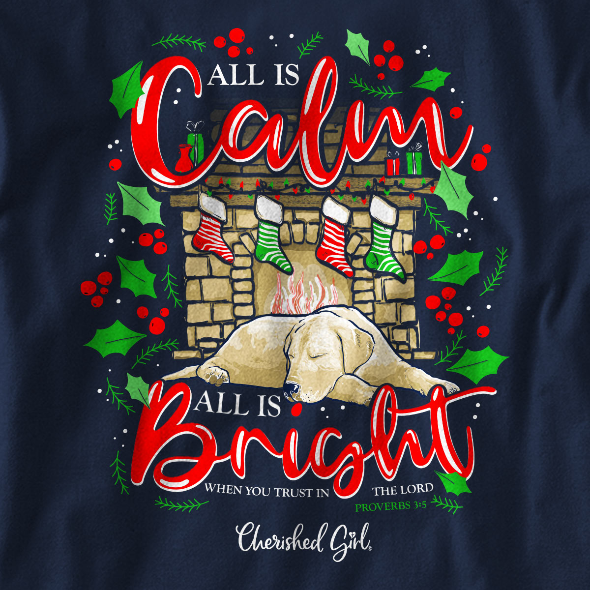 Let your heart be light in this classic “Calm & Bright” Long-Sleeve T-Shirt by Kerusso® in Navy. A toasty fire burns in the fireplace, the stockings are hung by the chimney with care, and your favorite pupper is snoozing in front of the fire as family gathers to celebrate the birth of our Lord and Savior, Jesus Christ. What a beautiful scene!