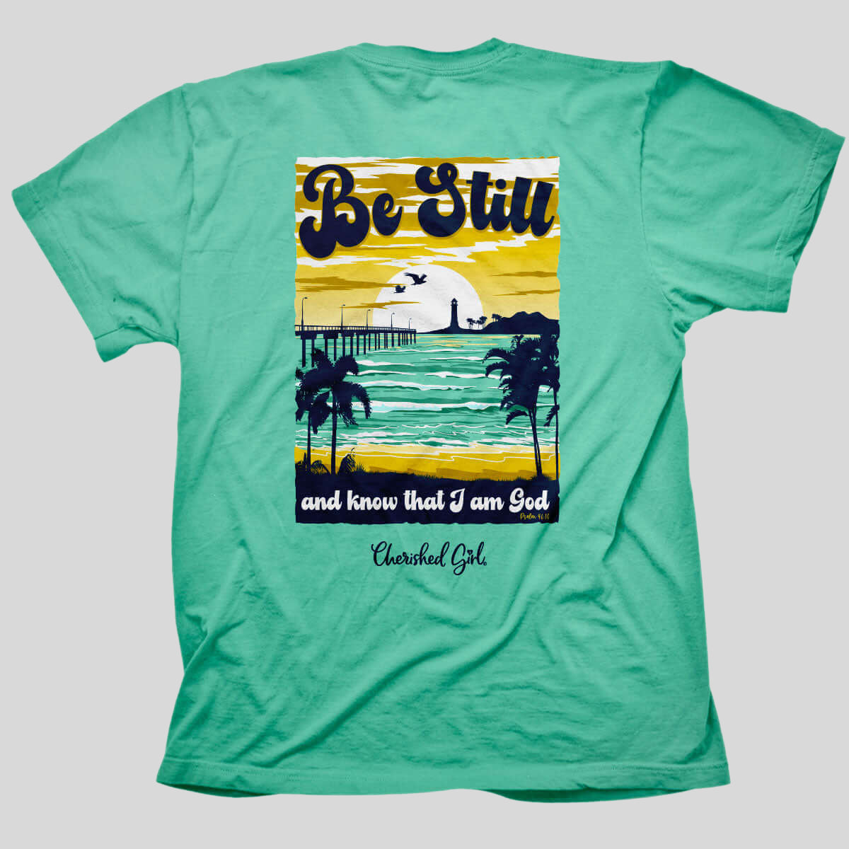Find lasting peace through faith in this chill “Be Still” T-shirt by Cherished Girl® in Cool Mint. The Lord doesn’t ask us to be so busy we don’t have time to catch our breath. In fact, His Word encourages us to take time to relax, and to hand our worries to Him in prayer as we praise His name.