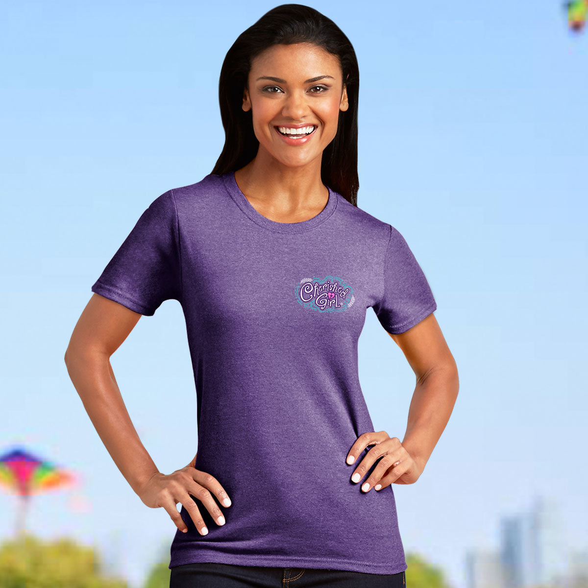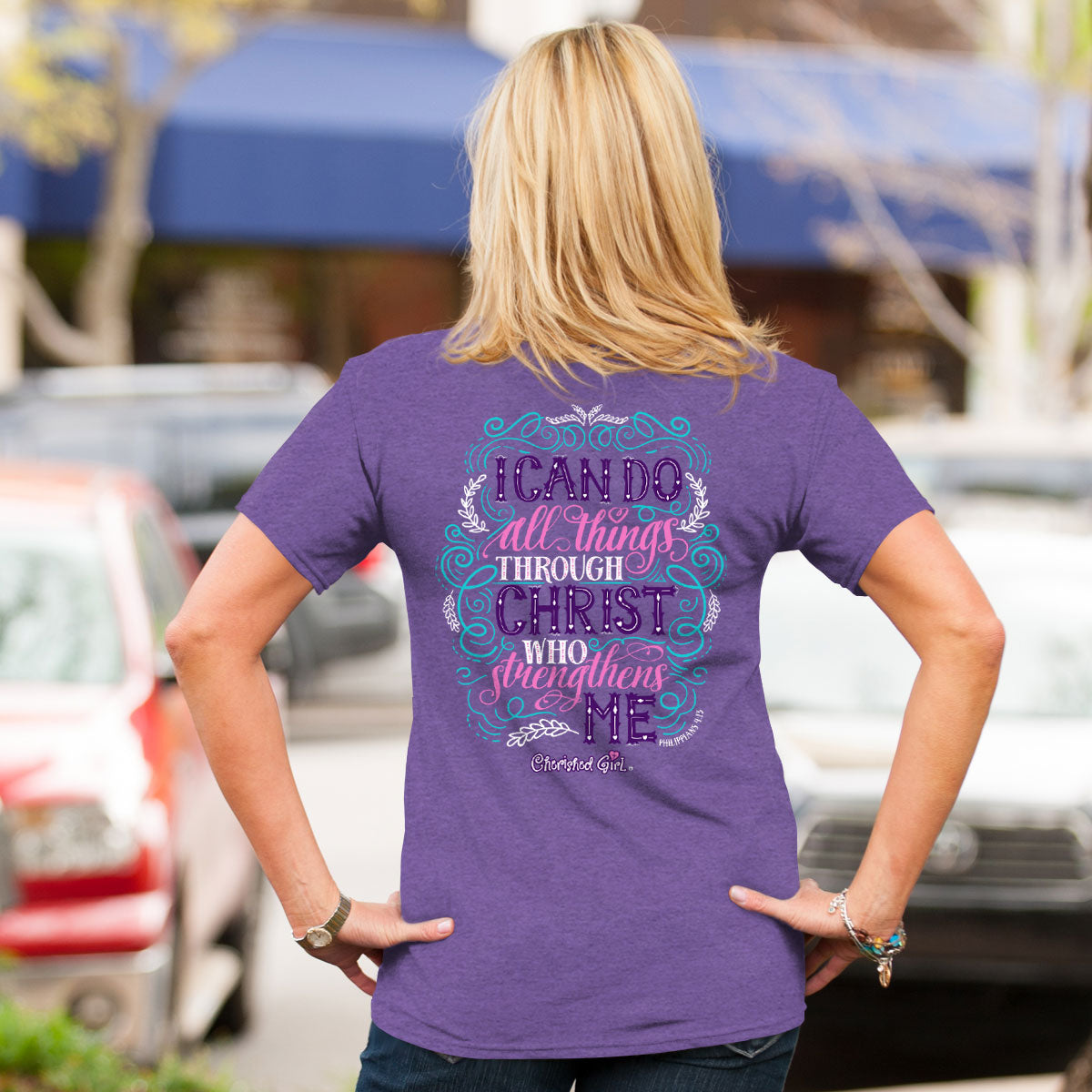Embrace a can-do attitude in this “Through Christ” T-Shirt in Retro Heather Purple by Cherished Girl®. Rise and greet each day knowing Jesus has given you what you need to conquer every mountain: that's what faith is for! This cotton blend T-shirt is soft for all-day comfort with double-needle stitching for lasting quality.