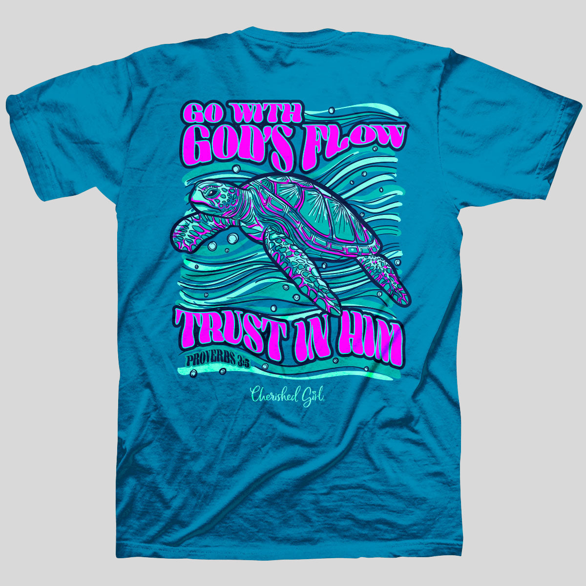 Go where the current takes you in this groovy “Trust Turtle” Cherished Girl® T-Shirt in Pacific Blue. There is no place, no circumstance, no enemy who can conquer us when we are following Jesus. Our future is assured in His name, for all eternity!