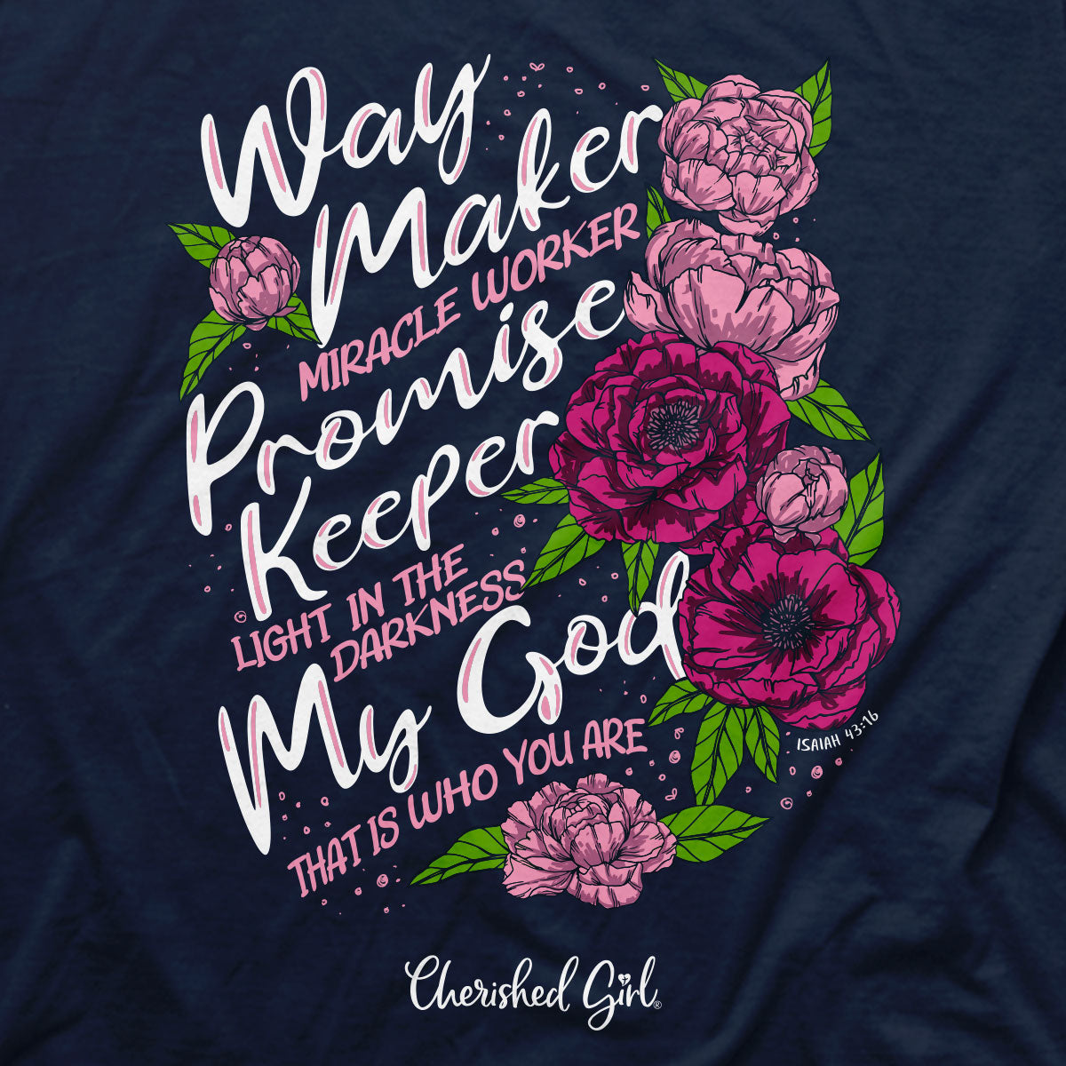 The Cherished Girl® Way Maker™ shirt is a symbol of unwavering strength and faith. Every stitch of this piece of clothing encourages you to walk confidently on the path Jesus has set for you. Let the glory of the Miracle Worker shine on everyone you meet.