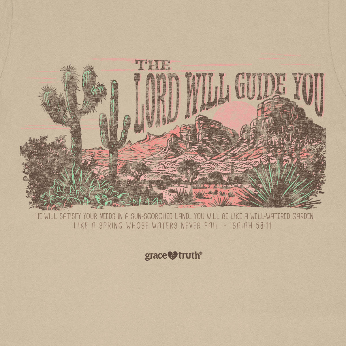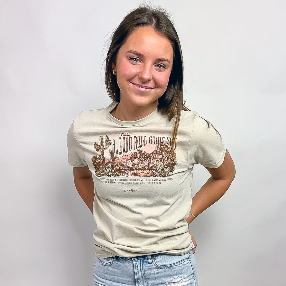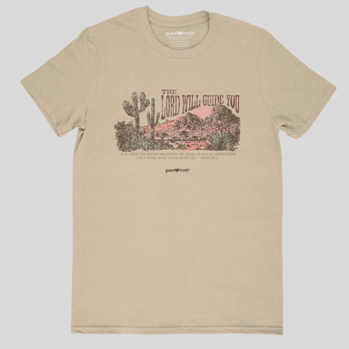 Seek direction in this cool outdoorsy “Desert” T-shirt by grace & truth® in Putty. You don’t have to wander in the desert searching for answers and provision—you need only to reach out to the Lord in prayer, asking for His guidance and the resources you need to keep going.