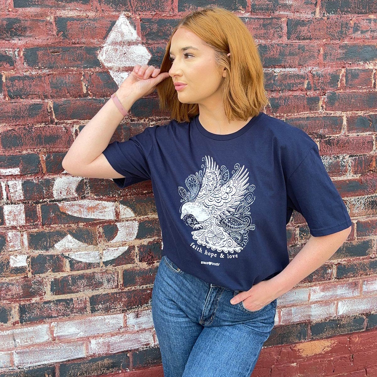 Make an artsy statement of faith in this chic “FHL Dove” T-shirt by grace & truth® in Navy. Faith sets us free to fly through life with faith, hope, and love for the journey.