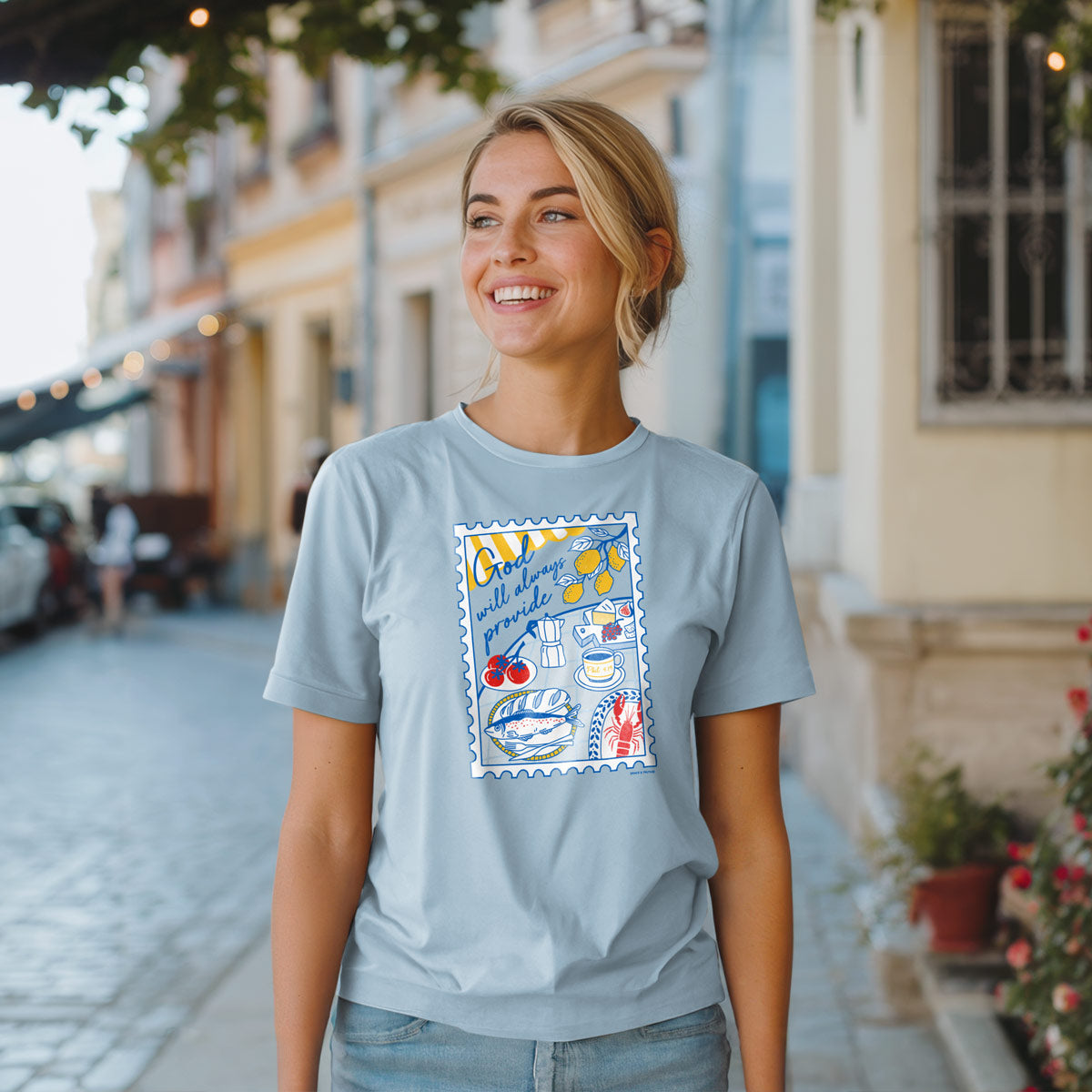 Trust in God’s faithful provision with the “God Will Always Provide” grace & truth® T-shirt. Featuring charming, hand-drawn illustrations of daily essentials framed like a vintage label, this chambray Comfort Colors® tee reflects the promise found in Matthew 14:18–20—that God multiplies what we place in His hands.