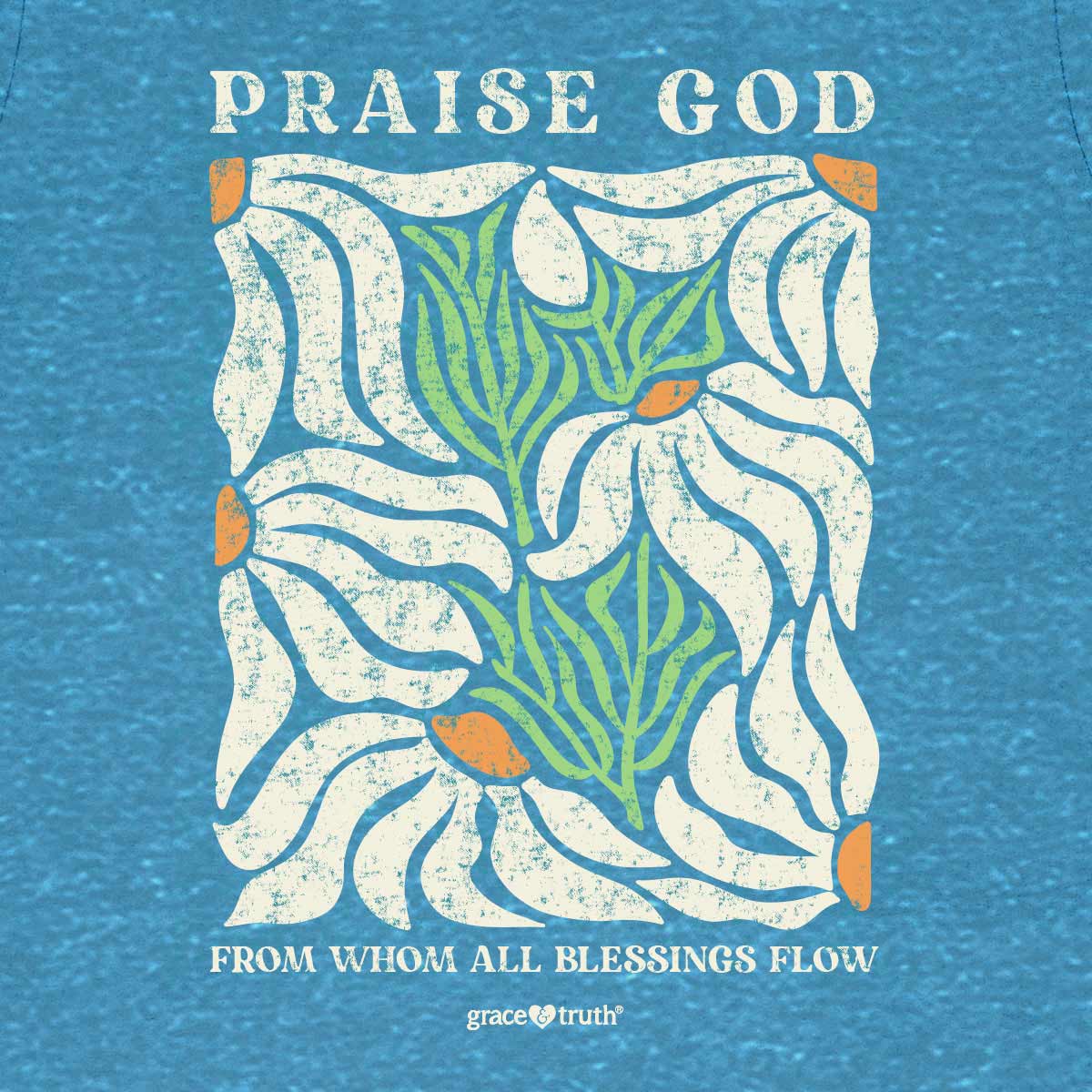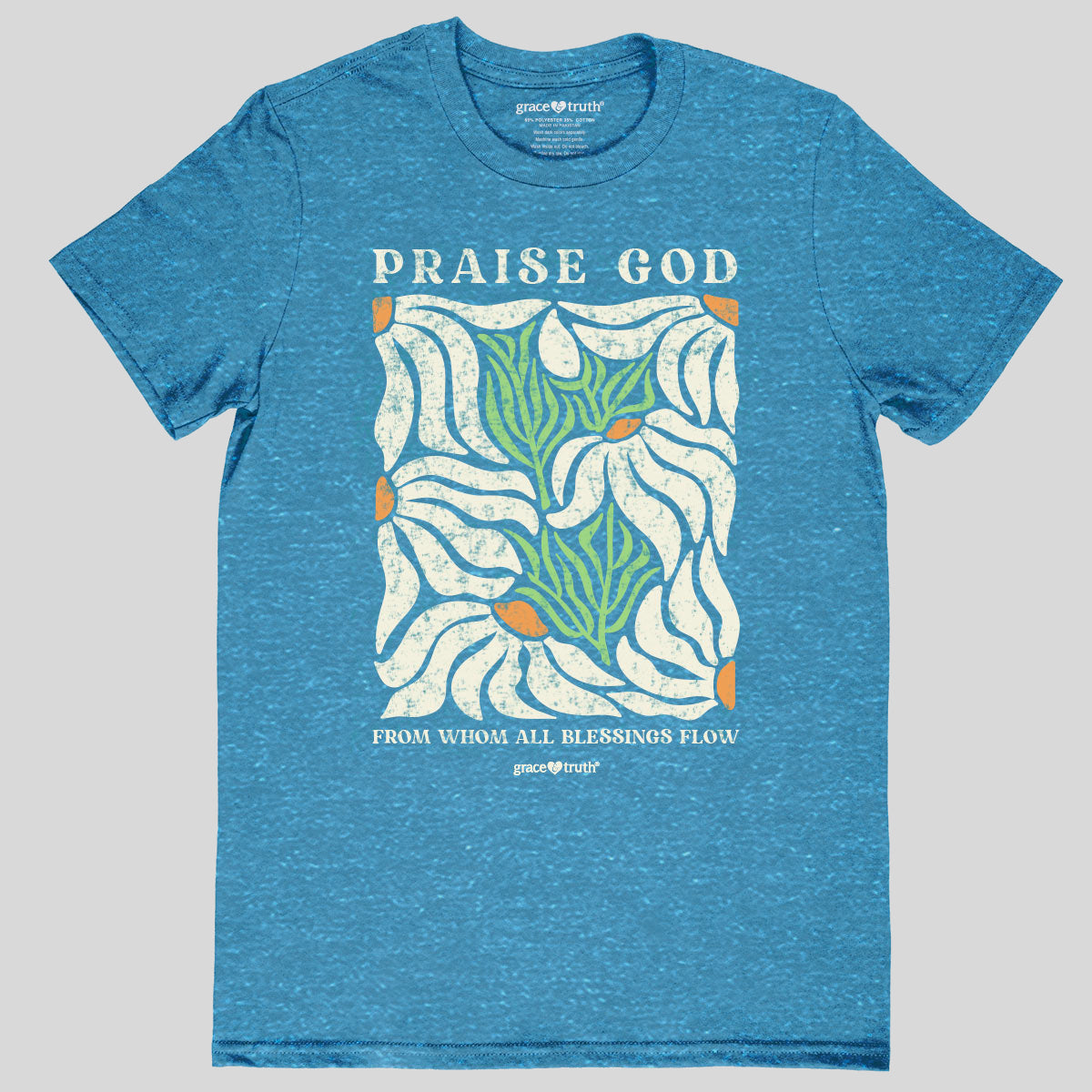 Sing a song of praise to the Lord in this Art Nouveau-inspired “Praise God Flowers” T-shirt by grace & truth® in Heather Galapagos Blue. When we cultivate our blessings by counting them often, our lives will bloom and grow.