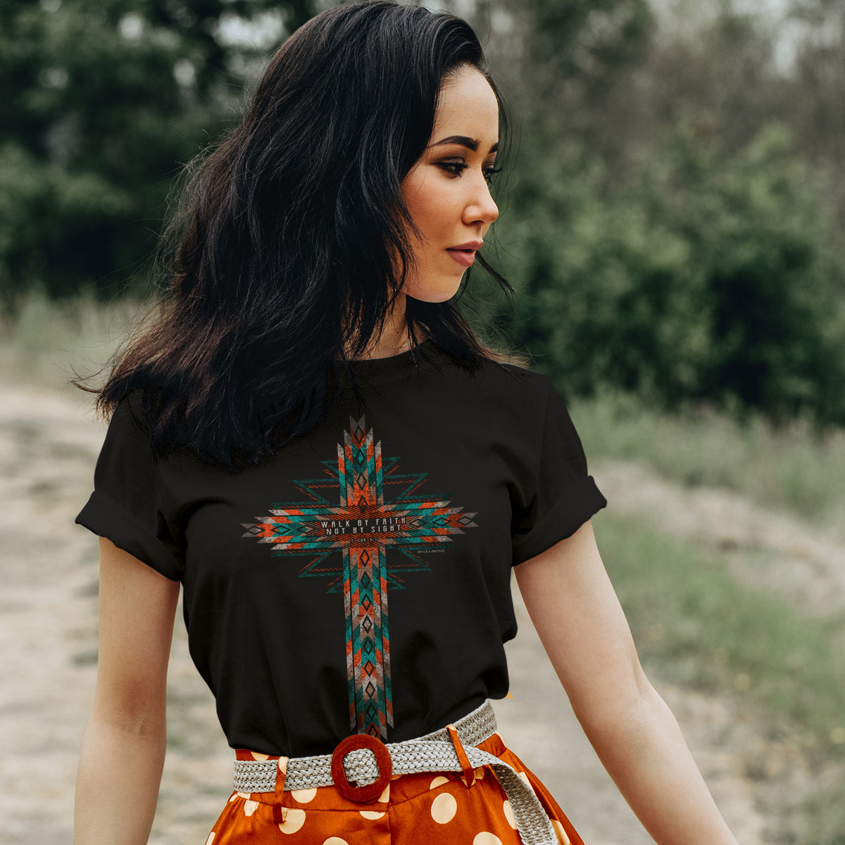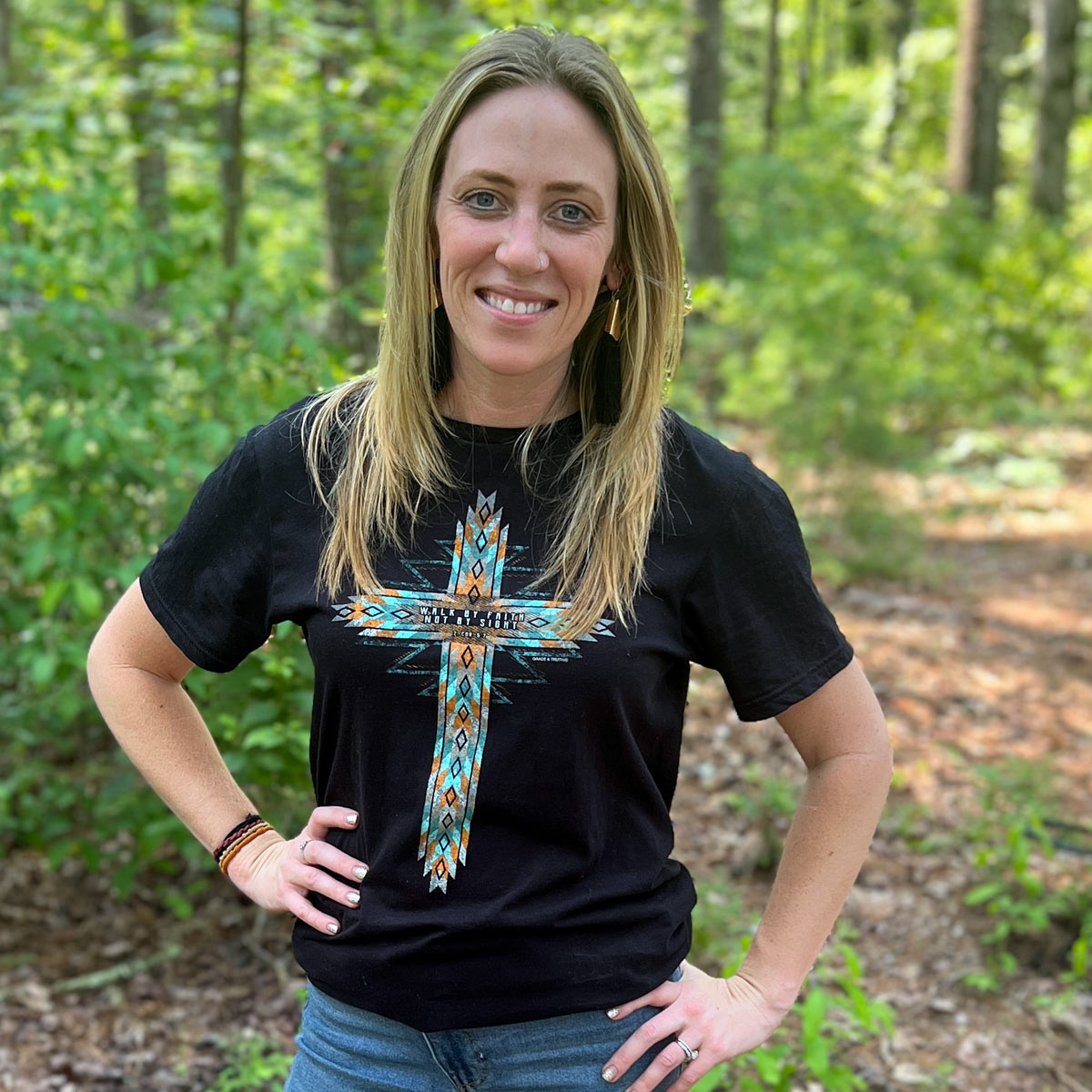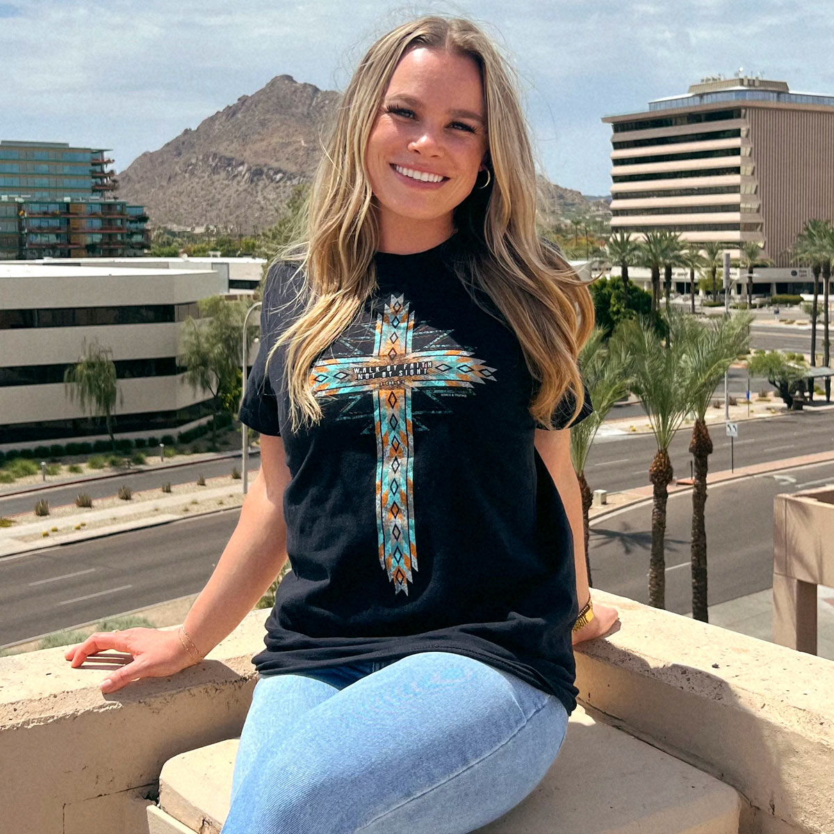 A beautiful cross, the symbol of God’s love for you, adorns this chic “Southwestern Cross” T-shirt by grace & truth® in Black. The message is simple: you know Whose you are, and you know where you’re going.