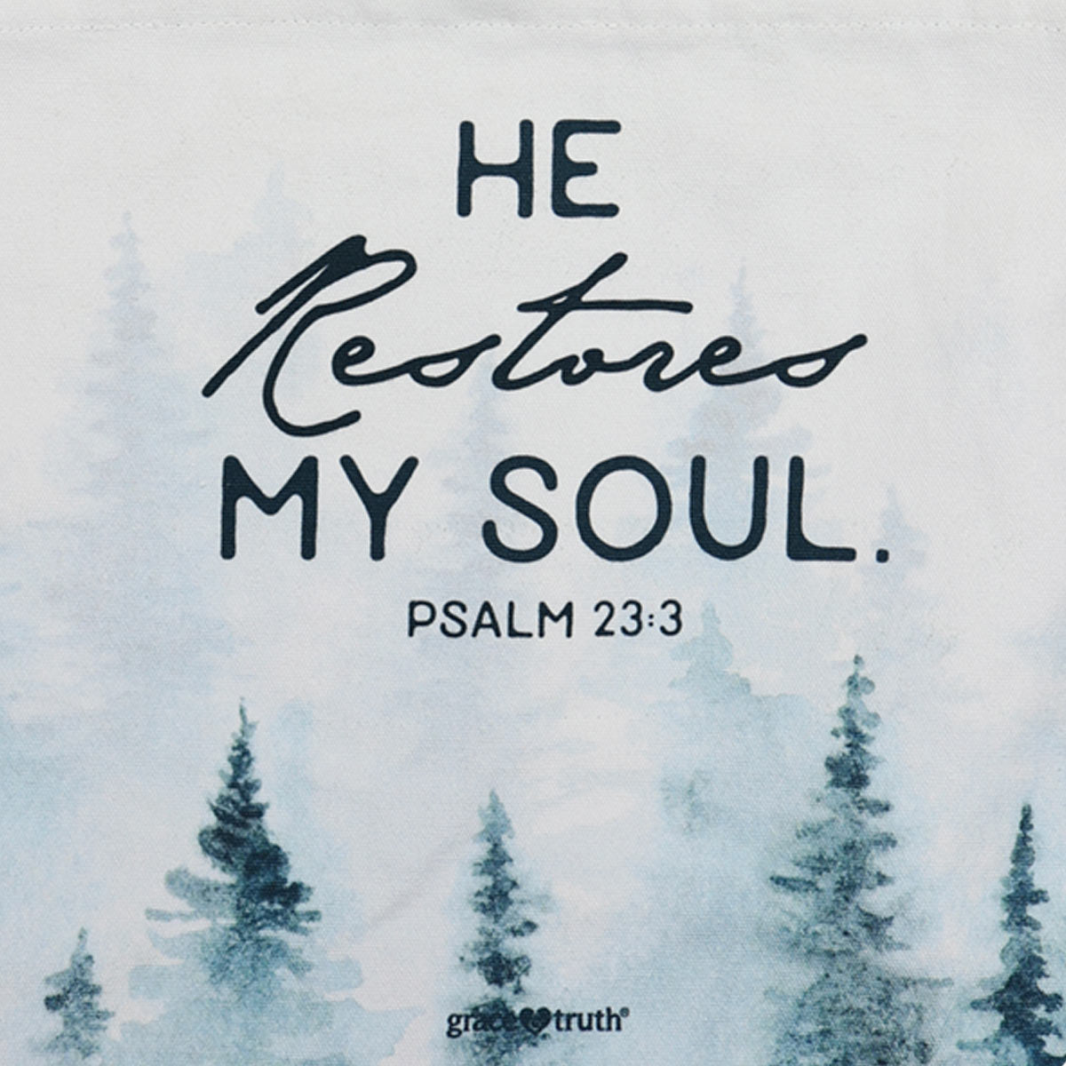 Seek the peace only the Lord can give with this chic woodsy “He Restores” Tote Bag by grace & truth® in White/Green. Our Heavenly Father created natural beauty, peace, and rest in order to restore our souls amid the chaos of this world. These spacious canvas totes feature a comfortable faux-leather strap, snap closure, and a removable bottom plate for extra stability.