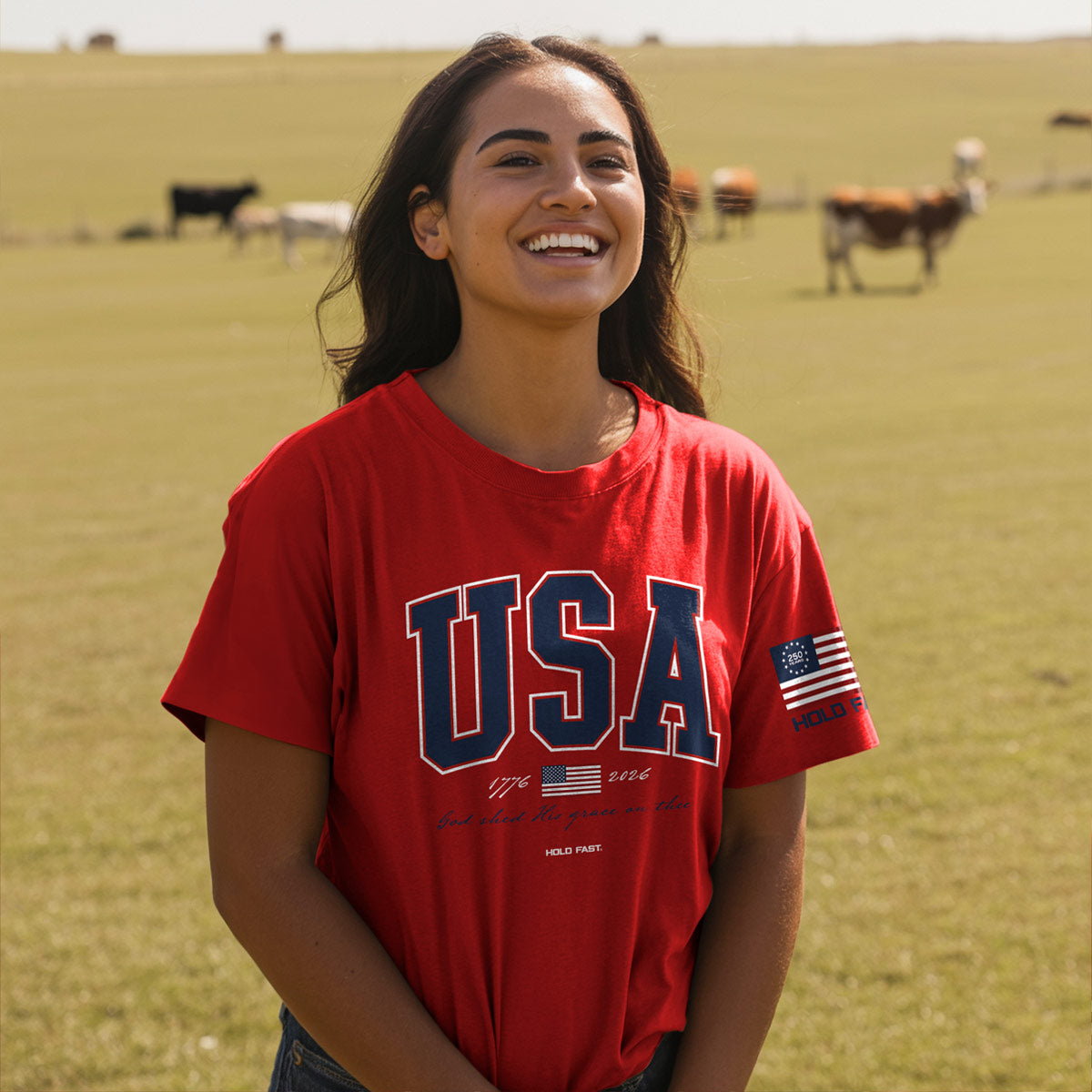 Stand tall in faith and freedom with the “USA Strong Red” Hold Fast® T-shirt. Featuring bold collegiate-style lettering and a distressed American flag sleeve detail, this design represents strength forged through faith and history. The powerful message—One Nation Under God—Since 1776—emphasizing the spiritual foundations of the American Founding Fathers.
