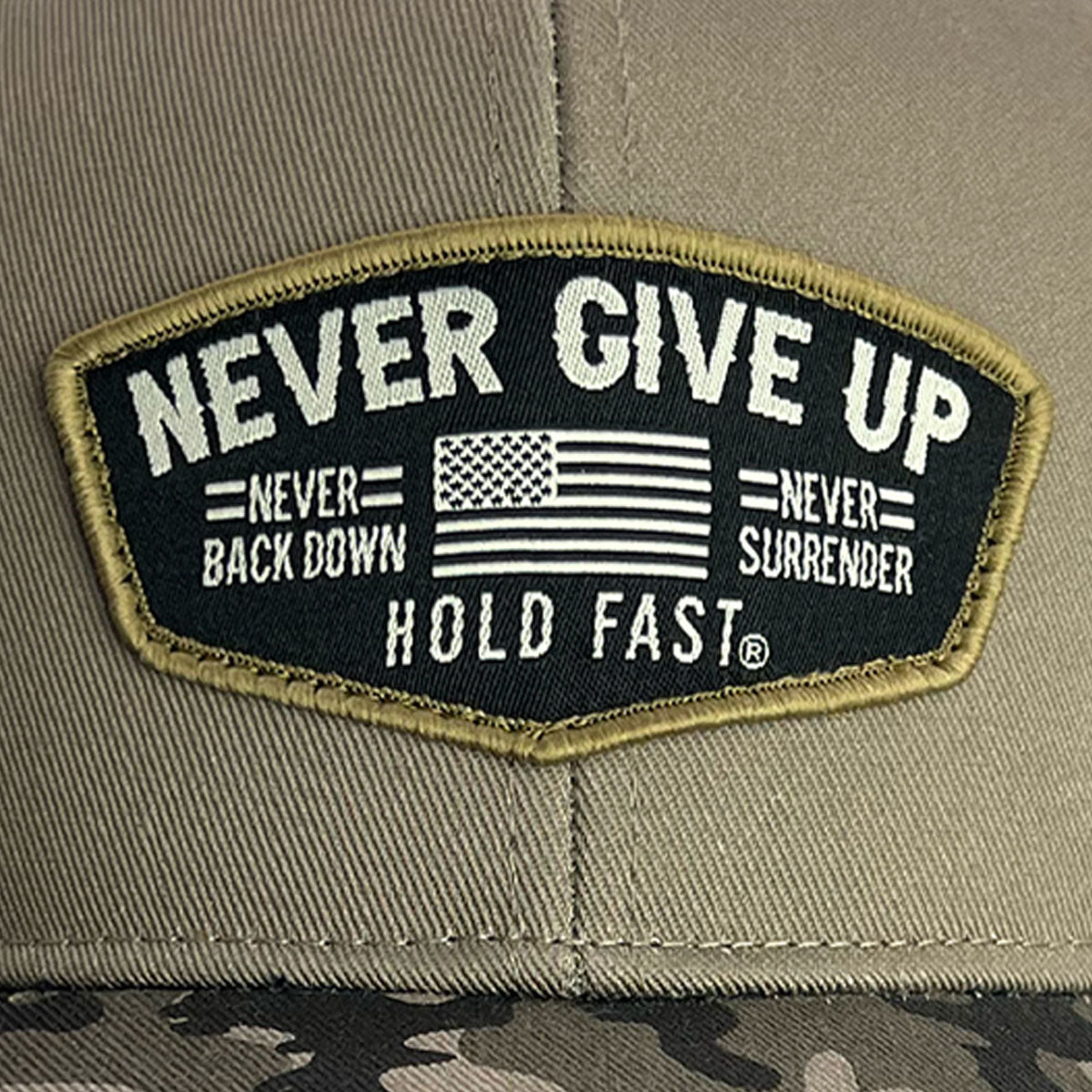 Stand your ground in this rugged “Never Give Up” Cap by HOLD FAST® in Tan/Camo. You aren’t a spectator in this life, you’re a participant: ready for battle, prepared to stand up for who and what you believe in. You will never surrender!
