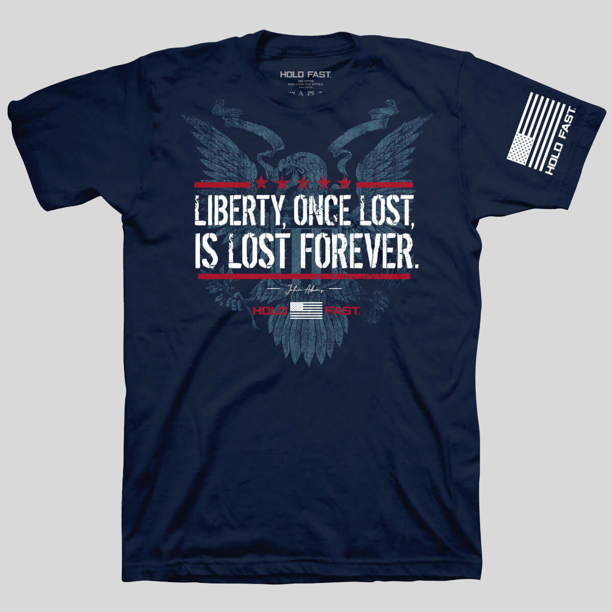 Cling to your freedom and defend it fiercely in this bold “Liberty Lost” T-shirt by HOLD FAST® in Navy. Founding Father John Adams, America’s first vice president and second president, was also a leader of the American Revolution that achieved independence from Great Britain. His passion for the freedom fought and won by himself and his peers was incredible.