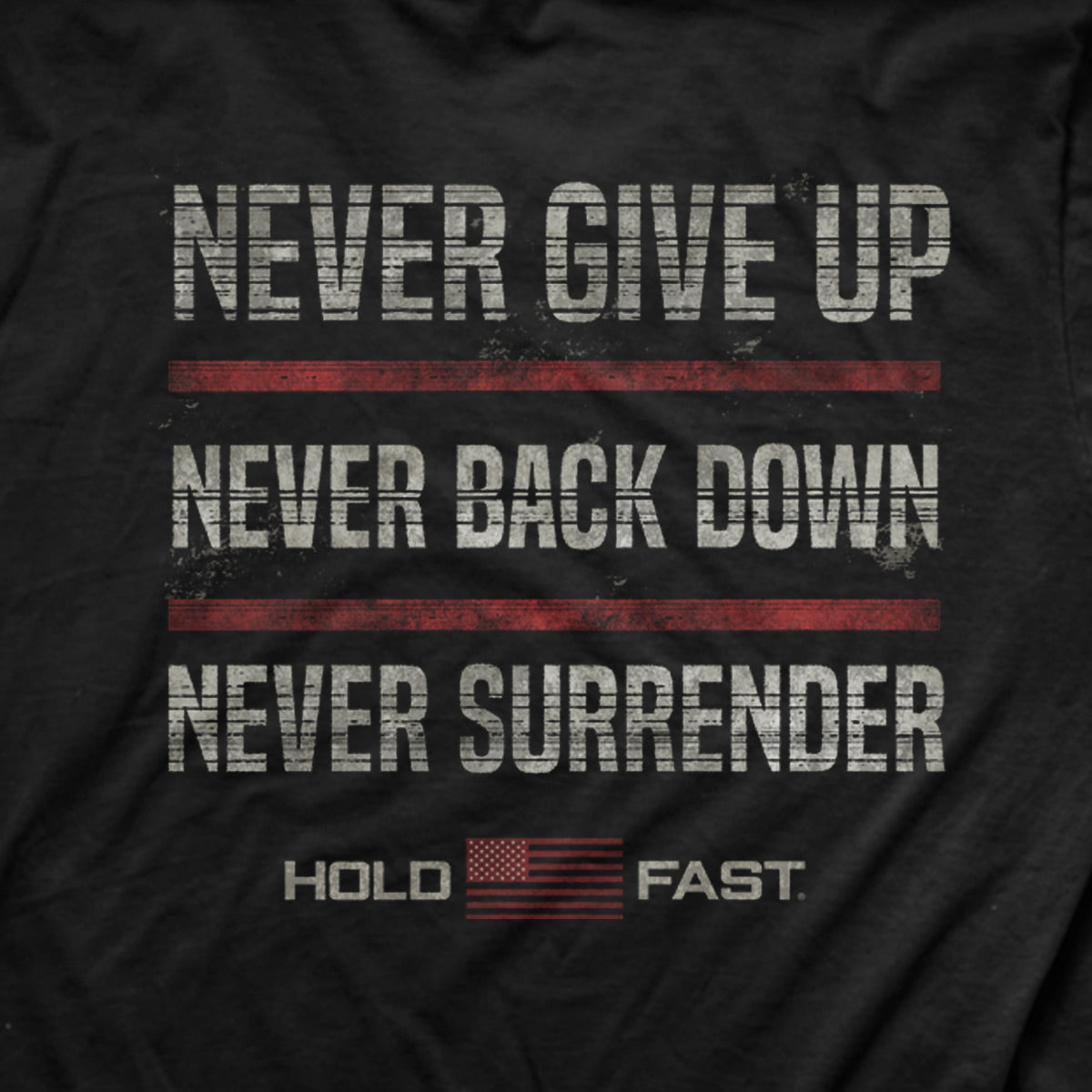 Stand your ground in this statement-making Never Give Up shirt designed by HOLD FAST® in Black. You aren’t a spectator in this life; you’re a participant, ready for battle, prepared to stand up for who and what you believe in. You will never surrender! Express your attitude in this shirt.