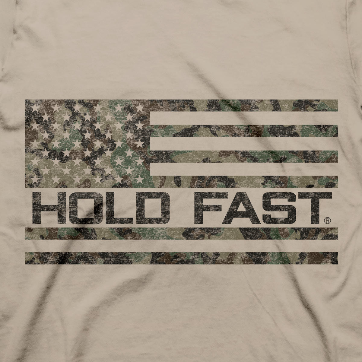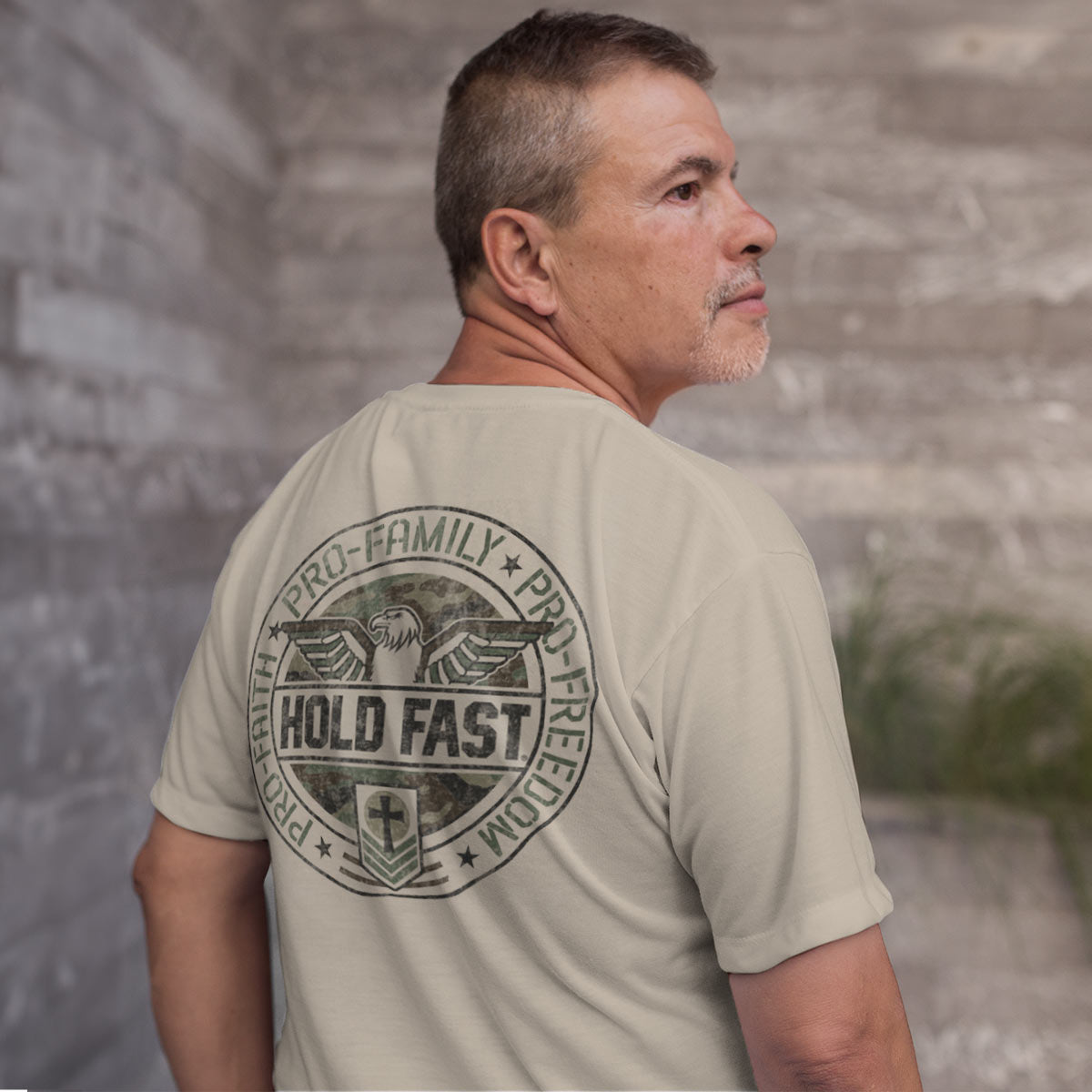 This rugged T-shirt offers an opportunity to show your faith in God, family, and country. Hold Fast celebrates the freedom given to us by our Savior and protected by the brave men and women of the United States Armed Forces and first responders. A proud eagle, our national bird and a longtime symbol for the freedom we enjoy as Americans, perches front and center.