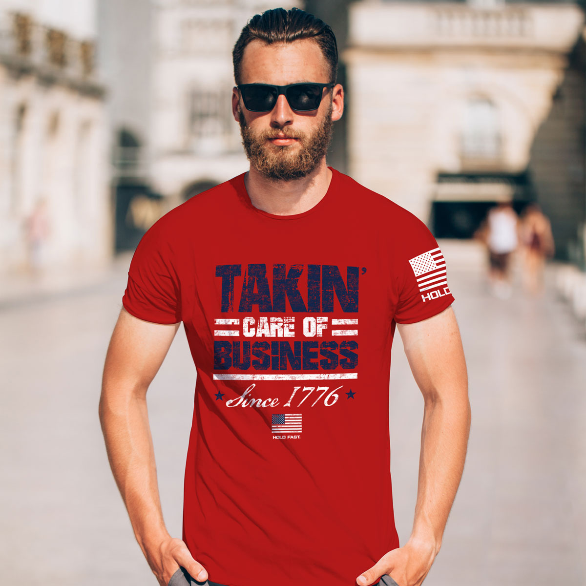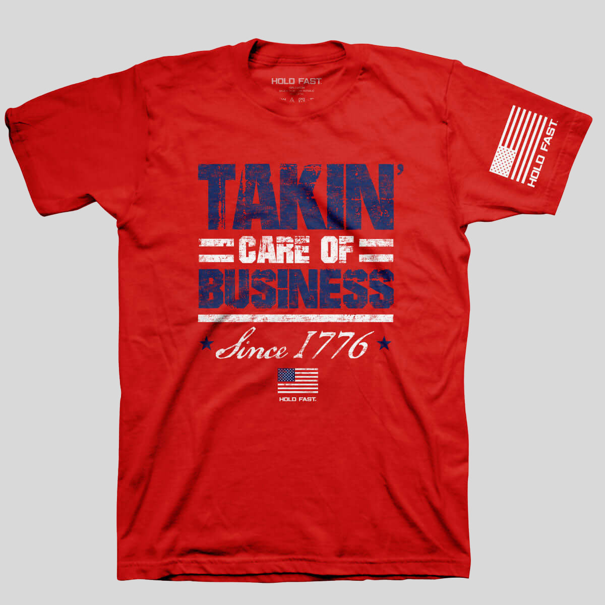 Boldly declare what you’re about in this patriotic “Takin’ Care Of Business” T-shirt by HOLD FAST® in Red. Our nation was founded on the principles of equality, freedom, and justice, and early Americans were willing to fight for these ideals.