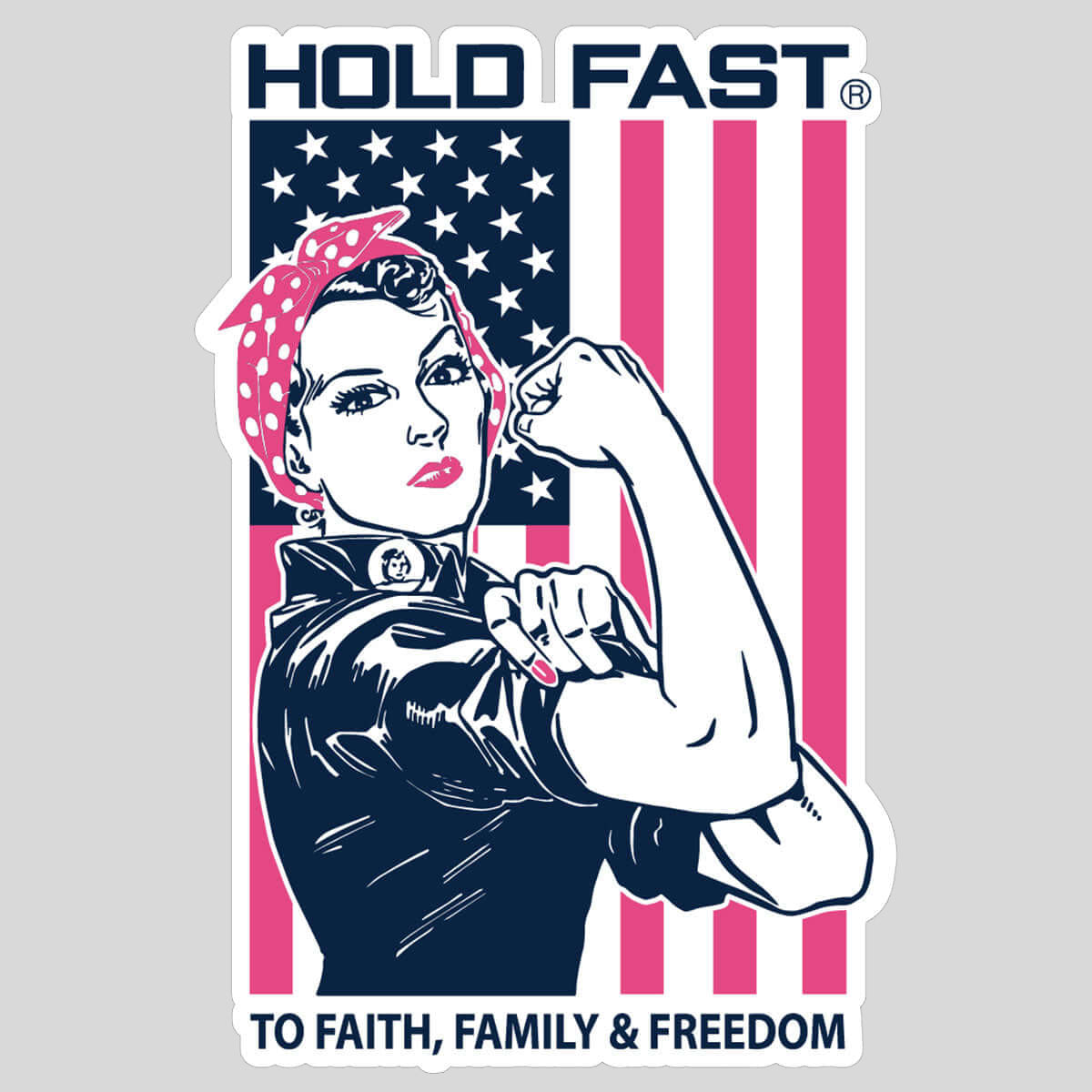 Offer a salute to the strong women in your life with this nostalgic “HF Rosie” Sticker by HOLD FAST®. This Rosie gal encourages others to hold fast to faith, family, and freedom. In times of war and times of peace, women have served their families, their country, and the Lord. These weather- and fade-resistant stickers are perfect for your car or bike, stainless tumbler, laptop, or anywhere you want to inspire yourself and others to keep the faith!