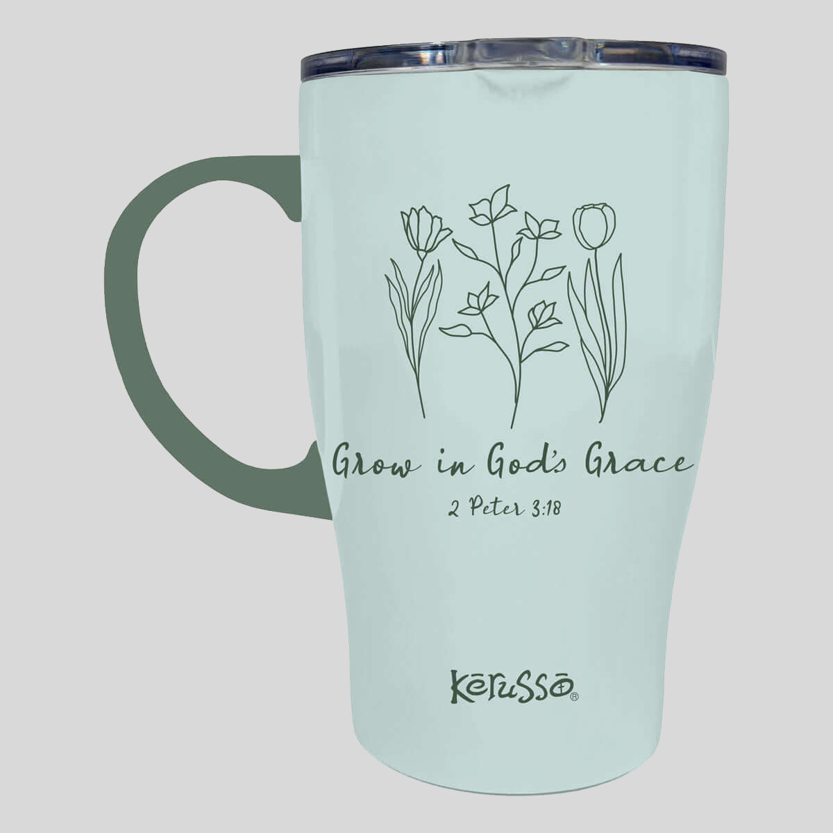 Your faith will bloom with every sip from this sweet “Grow In Grace” Kerusso® 15 oz. Stainless-Steel Mug with Handle in Green. It’s a practical vessel that keeps drinks ice-cold or piping hot for hours—perfect for home, work, or the car. Sometimes stormy weather or dry spells are what it takes for us to grow; we serve a good God who knows exactly what He’s doing, and has a plan for our lives.