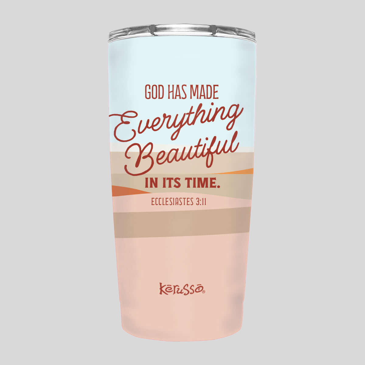 Embrace a beautiful outlook with this boho chic “Everything Beautiful” 20 oz. Stainless-Steel Tumbler by Kerusso® in Cream/Peach with a convenient slide lid. You’ll stay hydrated at work, school, or in the great outdoors with this practical thermal tumbler, and it’s a thoughtful reminder that God goes with you, and things are unfolding right on schedule in Jesus’ name.