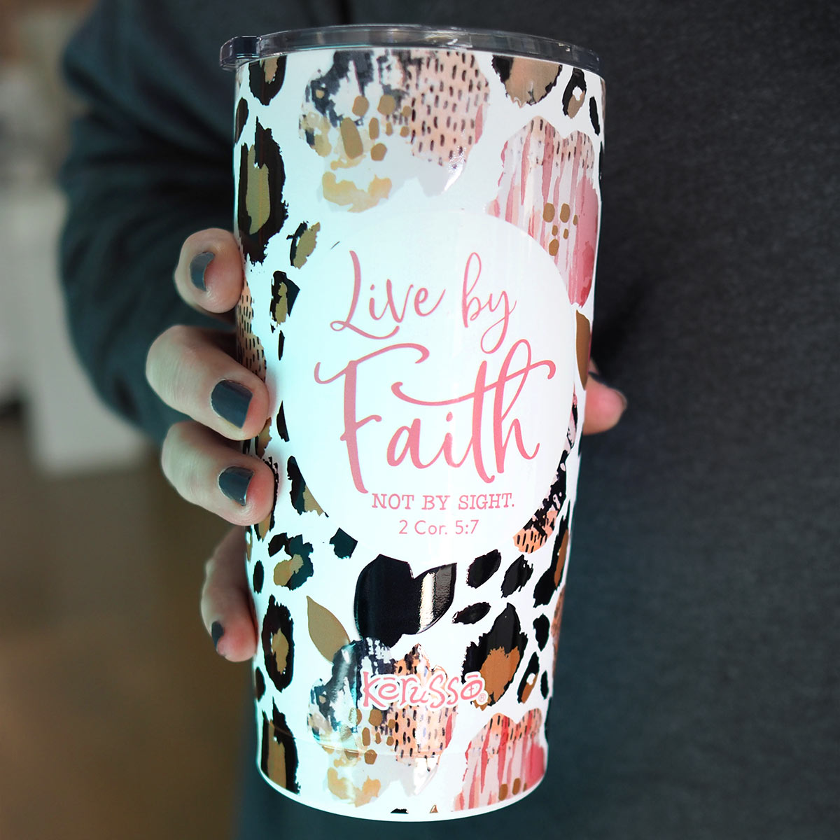 Take a [well-hydrated] walk on the wild side with this chic “Live By Faith” 20 oz. Stainless-Steel Tumbler by Kerusso® in White/Peach with a convenient slide lid. You’ll stay hydrated at work, school, or in the great outdoors with this practical thermal tumbler, and it’s a thoughtful reminder that God goes with you, and you can trust Him with the outcome in every circumstance.