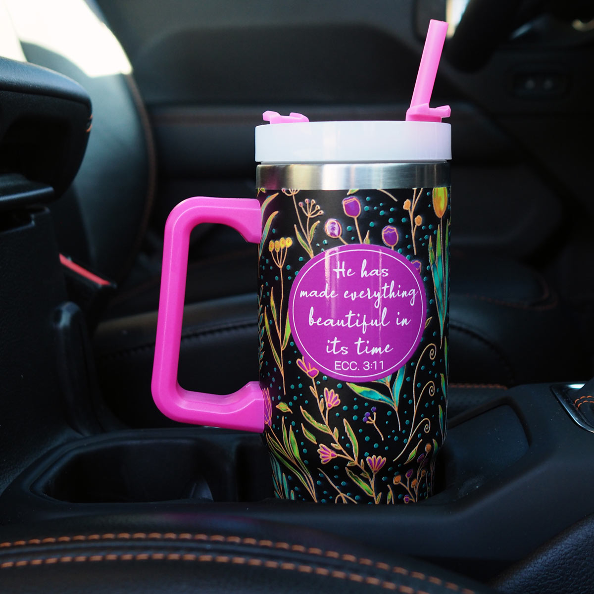 Embrace a beautiful outlook with this chic “Everything Beautiful” 30 oz. Handled Stainless-Steel Tumbler w/P Straw by Kerusso® in Black with a convenient slide lid. You’ll stay hydrated at work, school, or in the great outdoors with this practical thermal tumbler, and it’s a thoughtful reminder that God goes with you, and things are unfolding right on schedule in Jesus’ name.