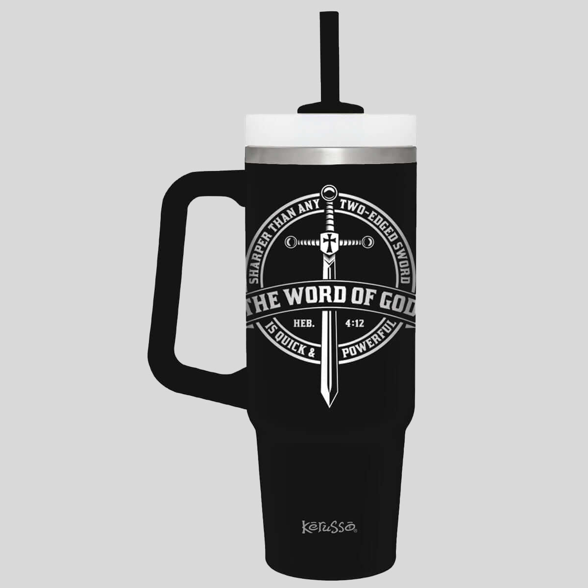 Take your stand against the darkness with every sip from this bold “Word Of God” Kerusso® 30 oz. Stainless-Steel Mug with Straw in Black. God’s Holy Word, the Bible, is a more powerful defense against this world than any sword. Keep it at the ready, referring to it often to keep your faith sharp.