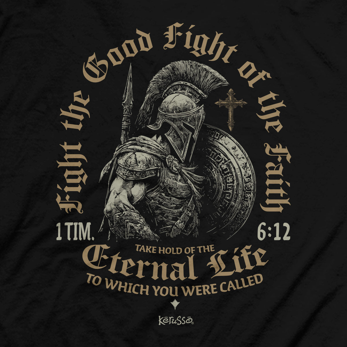 1 Timothy 6:12 calls us to “Fight the good fight of the Faith.” Reminding believers to cling tightly to the truth and press on with endurance. This design brings that verse to life with a strong, masculine presence that’s perfect for everyday wear, small group, the gym, or anywhere faith meets real life.