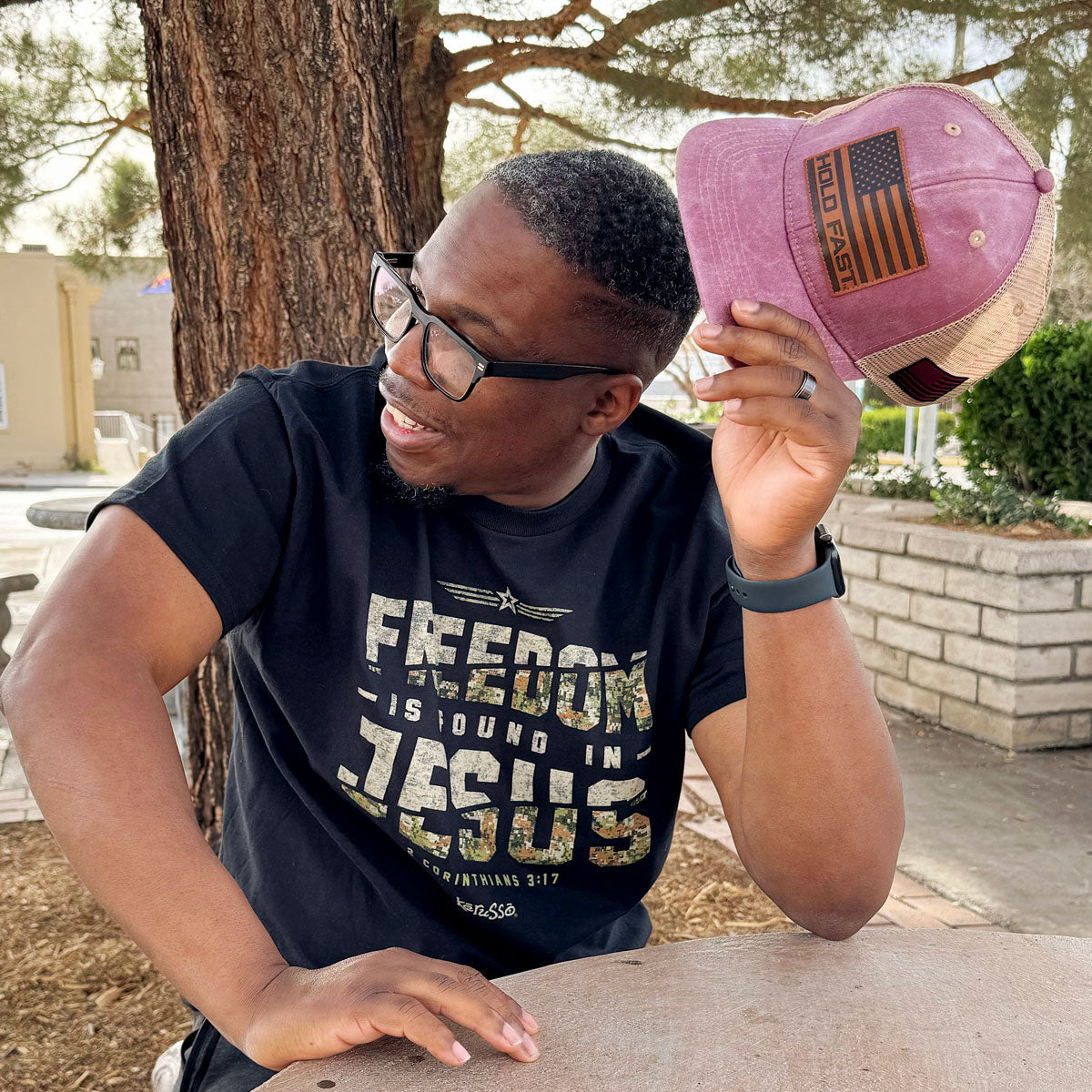 Give a nod to our ultimate source of freedom in this rugged “Freedom In Jesus” Kerusso® T-Shirt in Black. When we think of freedom, we think of the sacrifice made by those who pledge to protect our liberty, and our way of life. Jesus made the ultimate sacrifice for us on the cross at Calvary.