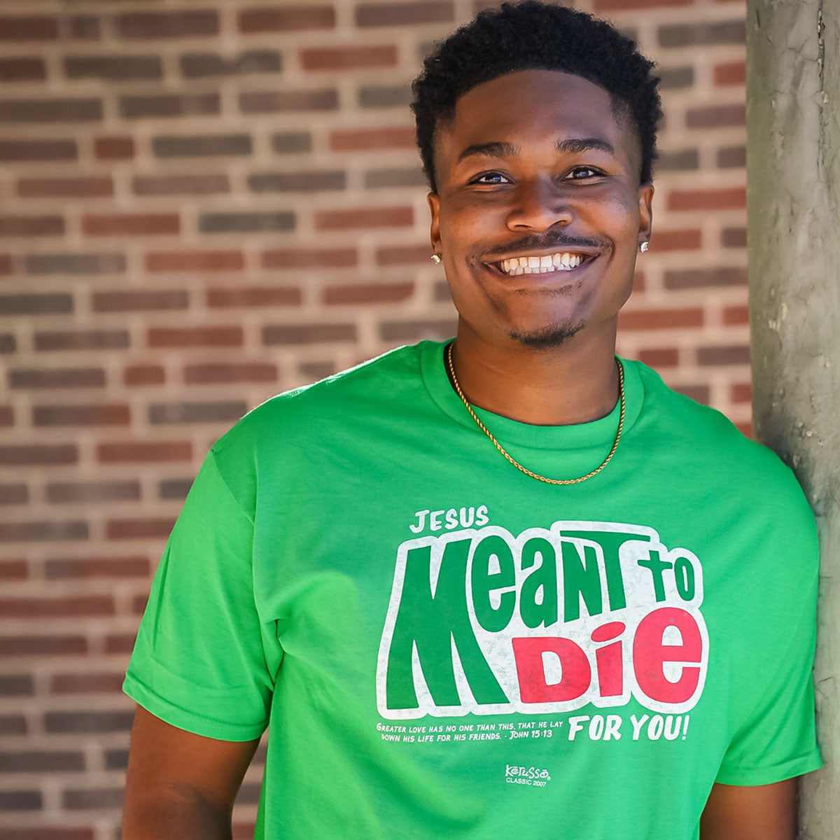 Share the sweetest Good News in this “Meant To Die” Kerusso® T-Shirt in Kelly Green. The incredible gift of salvation was no accident. God sent His only Son, Jesus Christ, to bear the burden of our sin on the cross at Calvary. His plan for us, and the incredible love it took to go through with it, is Good News indeed.