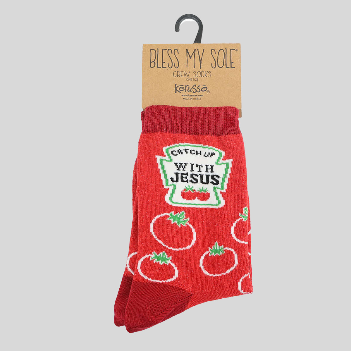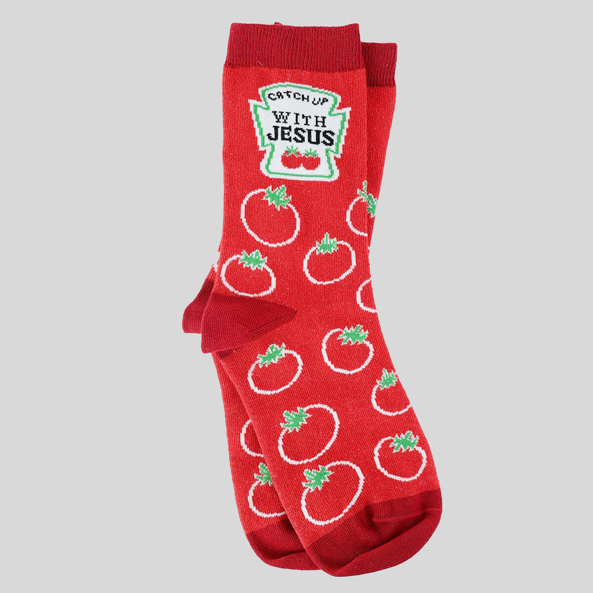 Catch up with Jesus in these kicky “Catch Up” Crew Socks by Kerusso® in Red. These breathable socks will keep your toes cozy all day. Ketchup goes with everything, and so do these clever socks! They’re a reminder to stop and pray, tell Jesus about your day, praise His name, and ask for His help with all the things.