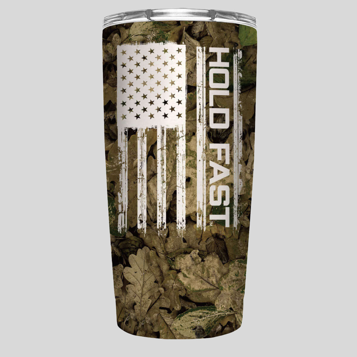 Proclaim your love of country when you carry this rugged “Hunting Camo Flag” 20 oz. Stainless Steel Tumbler in Camo by HOLD FAST®. Hold fast to your faith, your family, and your freedom. We can celebrate these things because of the sacrifice of those who serve in the United States Armed Forces, and ultimately because of the sacrifice of our Lord and Savior, Jesus Christ, on the cross at Calvary. When you pledge allegiance to the flag, or see those colors flying in the breeze, think on these things. Inspire your family, friends, and neighbors to look to you as an example of faith in our nation, and in the Lord.
