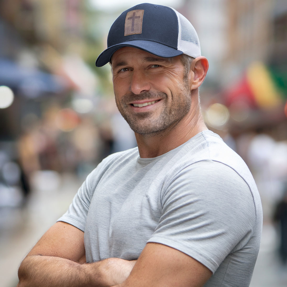Send a stylish message of faith in this mid-rise “Leather Cross” Cap by Kerusso® in Blue/White. The Lord goes before you in all things, and faith in Him makes all the difference in this life. A genuine leather patch in a handsome tobacco finish puts the cross front and center on this design.
