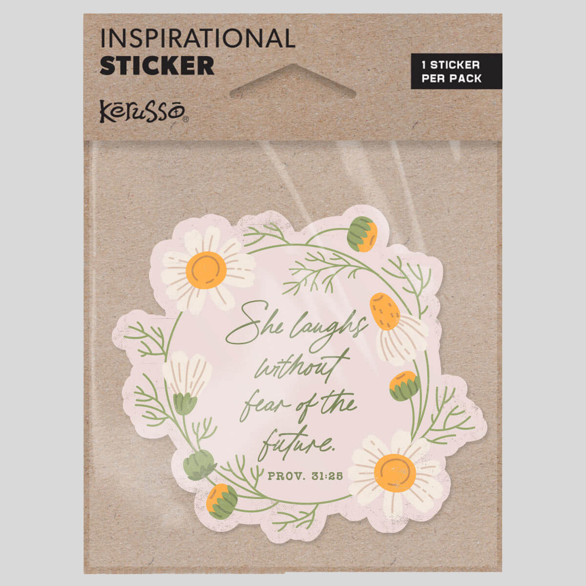 Let yourself laugh with joy when you see this “She Laughs” Sticker by Kerusso®. Let your heart be light as you place your trust fully in the Lord, leaning into His promises for today, and the hope He gives us for the future. This weather and fade-resistant sticker will look great on your car, laptop, or water bottle.