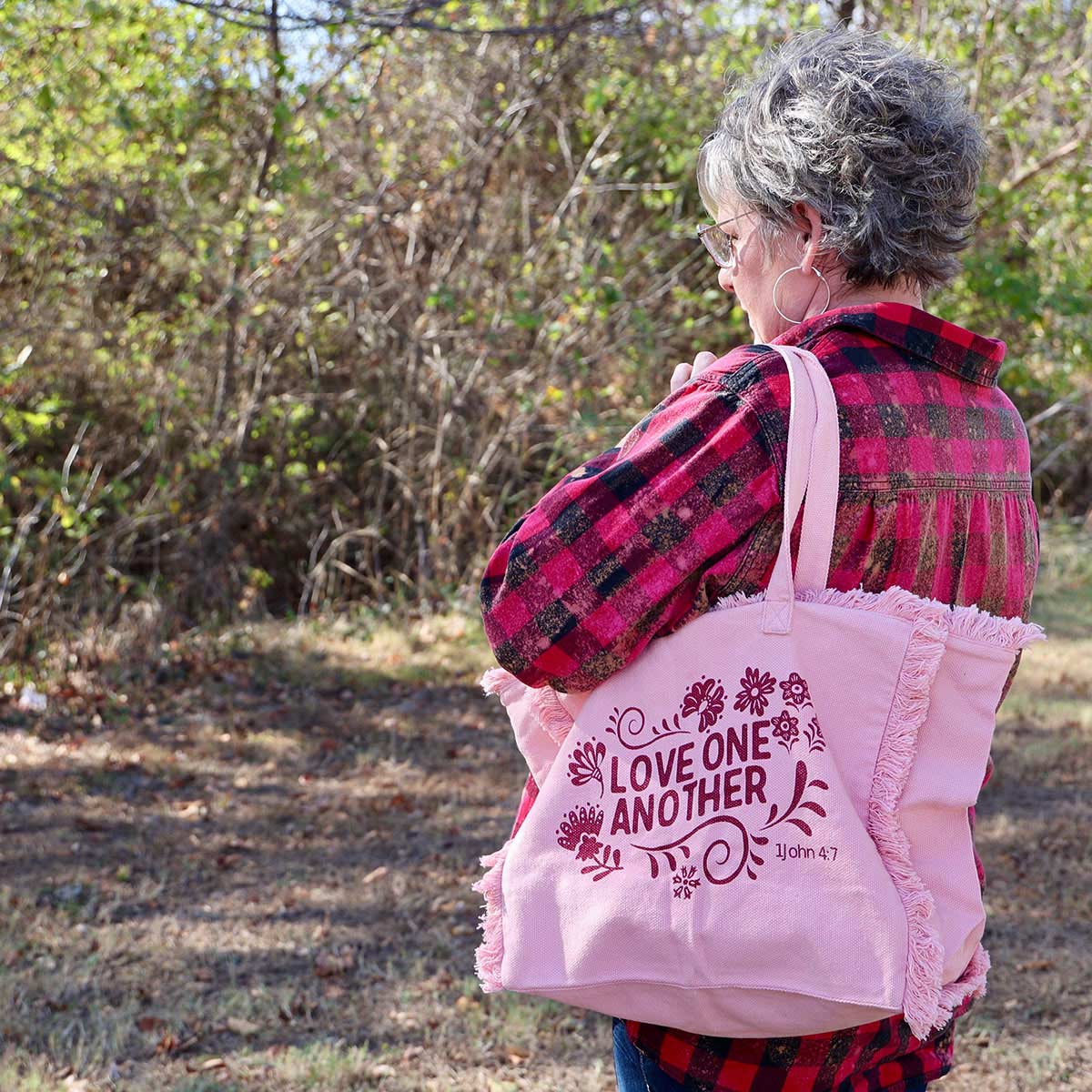 Share the love with this charming “Love” Tote Bag by Kerusso® in dusty Pink. Love comes from God, and the Bible encourages us to love one another. What a beautiful way to live life! This practical tote is a handy reusable shopping bag, everyday bag, or for Bible study. Makes a fun gift!
