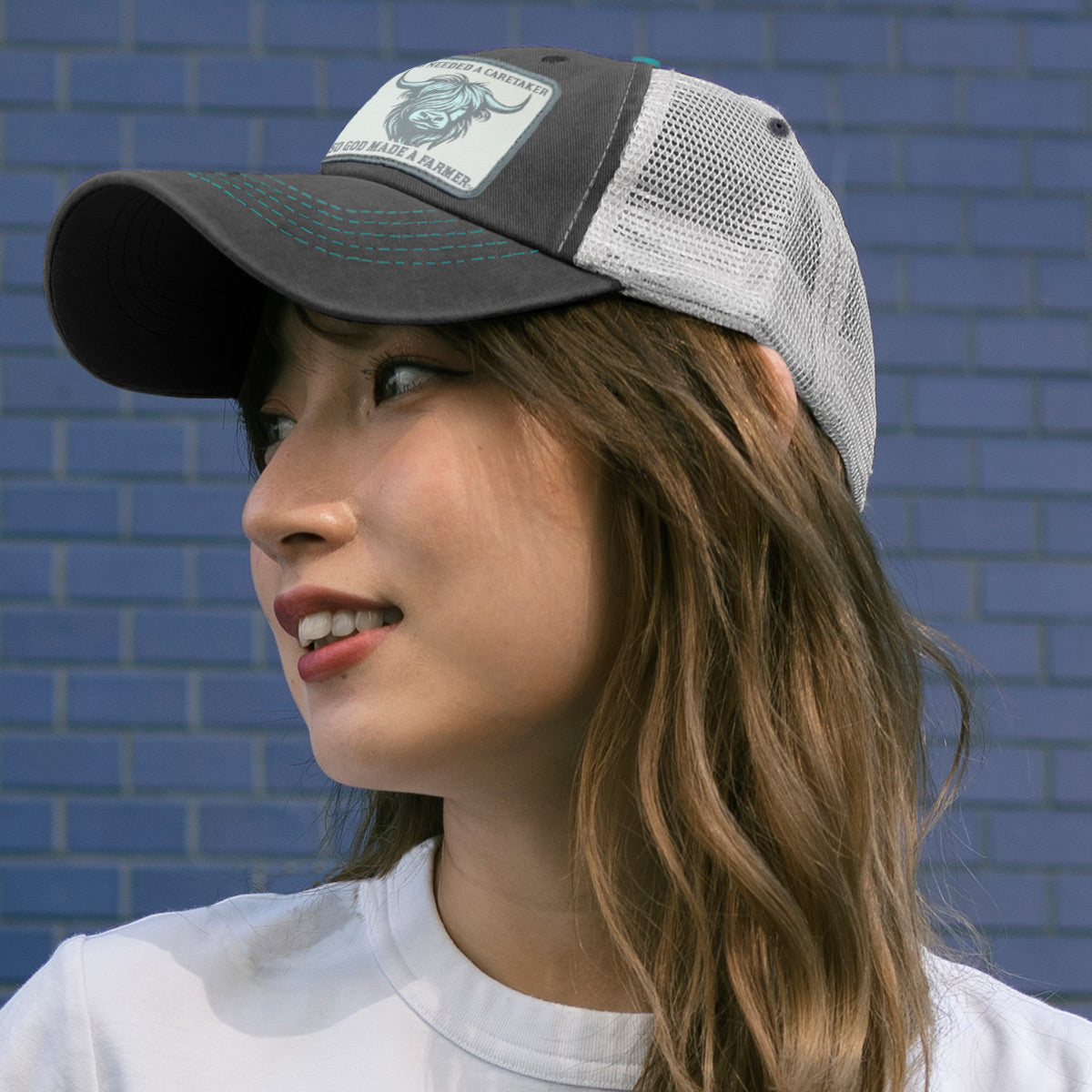 In November 1978 at the National FFA Convention in Kansas City, Missouri, American broadcaster Paul Harvey delivered his famous “So God Made a Farmer” speech. In just under 2 minutes and 30 seconds, Harvey shared honest, heartfelt thoughts on the humble farmer, “I need somebody willing to get up before dawn, milk cows, work all day in the fields, milk cows again, eat supper, then go to town and stay past midnight at a meeting of the school board—so God made a Farmer.” This stylish cap showcases one of God’s cutest creations, and it’s a reminder of the incredible work accomplished by family farmers across the nation.