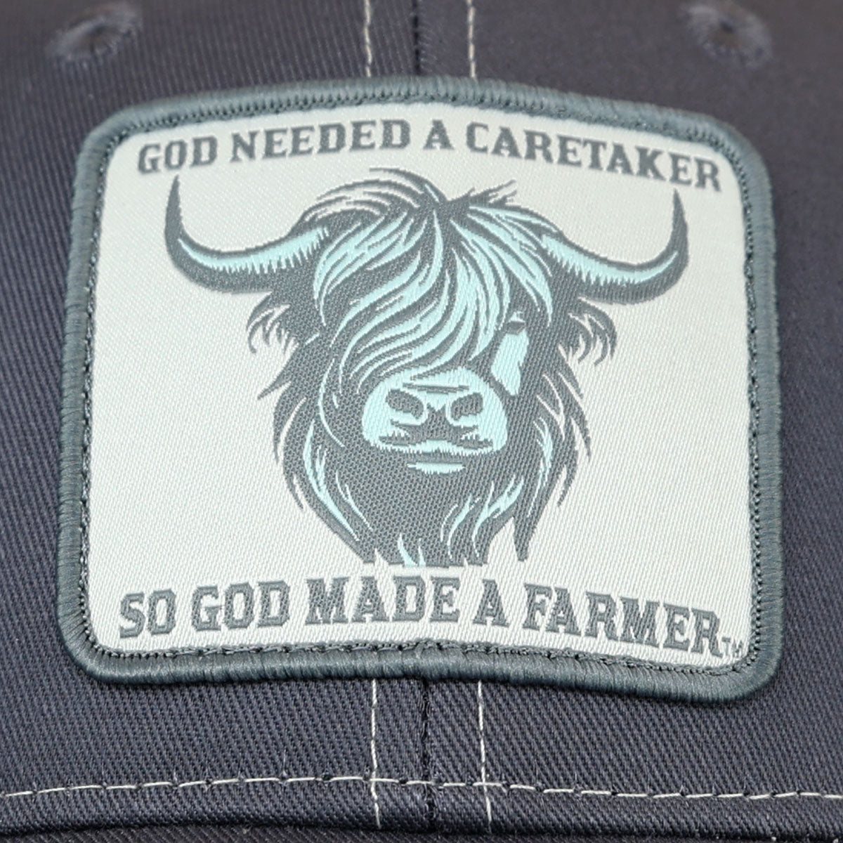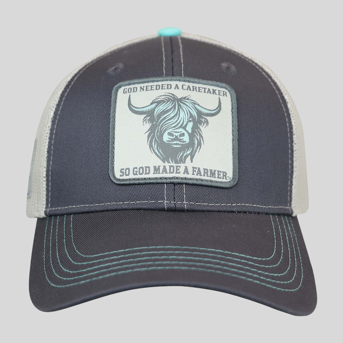 Pay homage to your favorite bovine pals in this sweet “Highland Cow” Cap by So God Made A Farmer™ brand apparel licensed by Kerusso® in Grey. Farm and ranch families feed the nation, and we owe a lot to the humble family farm. Cattle need to be raised, fields tended to, and God calls on farm families to get it done, rain or shine.